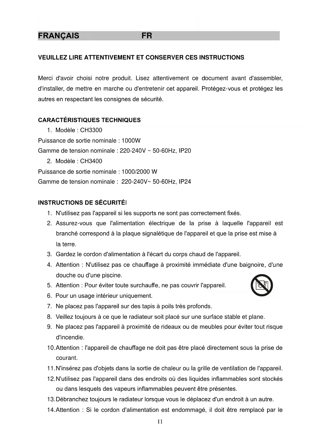 10. Attention : l'appareil de chauffage ne doit pas être placé directement sous la prise de