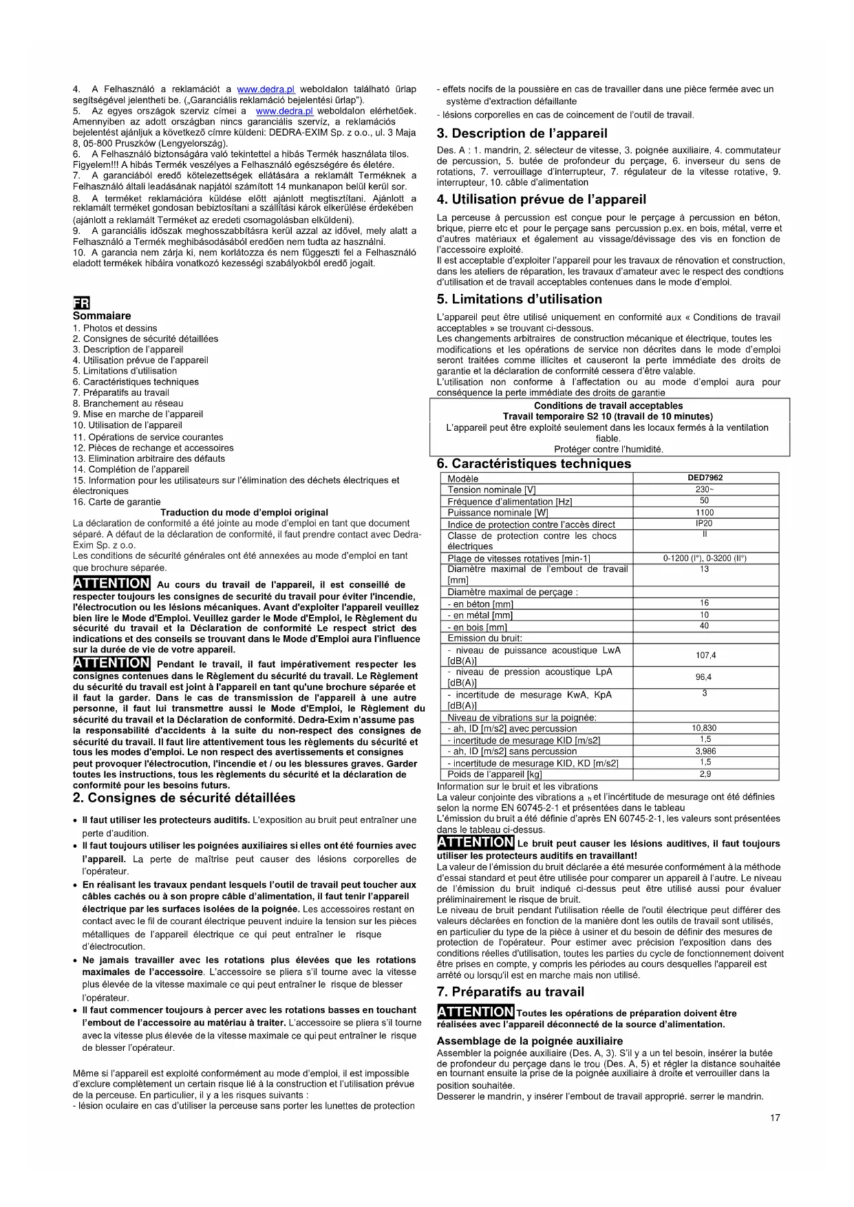 Traduction du mode d’emploi original La déclaration de conformité a été jointe au mode d’emploi en tant que document séparé. A défaut de la déclaration de conformité, il faut prendre contact avec Dedra- Exim Sp. z o.o. Les conditions de sécurité générales ont été annexées au mode d’emploi en tant que brochure séparée. ATTENTION Au cours du travail de l'appareil, il est conseillé de respecter toujours les consignes de securité du travail pour éviter l'incendie, l'électrocution ou les lésions mécaniques. Avant d'exploiter l'appareil veuillez bien lire le Mode d'Emploi. Veuillez garder le Mode d'Emploi, le Règlement du sécurité du travail et la Déclaration de conformité Le respect strict des indications et des conseils se trouvant dans le Mode d'Emploi aura l'influence sur la durée de vie de votre appareil. ATTENTION Pendant le travail, il faut impérativement respecter les consignes contenues dans le Règlement du sécurité du travail. Le Règlement du sécurité du travail est joint à l'appareil en tant qu'une brochure séparée et il faut la garder. Dans le cas de transmission de l'appareil à une autre personne, il faut lui transmettre aussi le Mode d'Emploi, le Règlement du sécurité du travail et la Déclaration de conformité. Dedra-Exim n'assume pas la responsabilité d'accidents à la suite du non-respect des consignes de sécurité du travail. Il faut lire attentivement tous les règlements du sécurité et tous les modes d'emploi. Le non respect des avertissements et consignes peut provoquer l'électrocution, l'incendie et / ou les blessures graves. Garder toutes les instructions, tous les règlements du sécurité et la déclaration de conformité pour les besoins futurs.