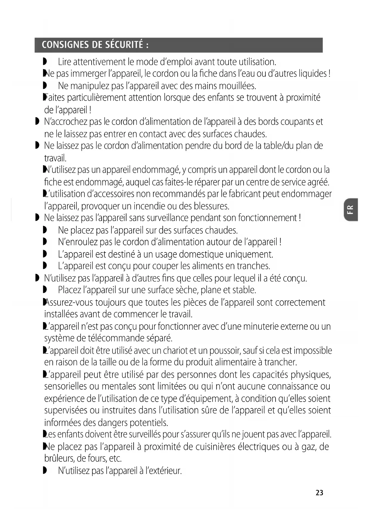 L’utilisation d’accessoires non recommandés par le fabricant peut endommager l’appareil, provoquer un incendie ou des blessures. Ne laissez pas l’appareil sans surveillance pendant son fonctionnement ! Ne placez pas l’appareil sur des surfaces chaudes. N’enroulez pas le cordon d’alimentation autour de l’appareil ! L’appareil est destiné à un usage domestique uniquement. L’appareil est conçu pour couper les aliments en tranches. N’utilisez pas l’appareil à d’autres fins que celles pour lequel il a été conçu. Placez l’appareil sur une surface sèche, plane et stable.
