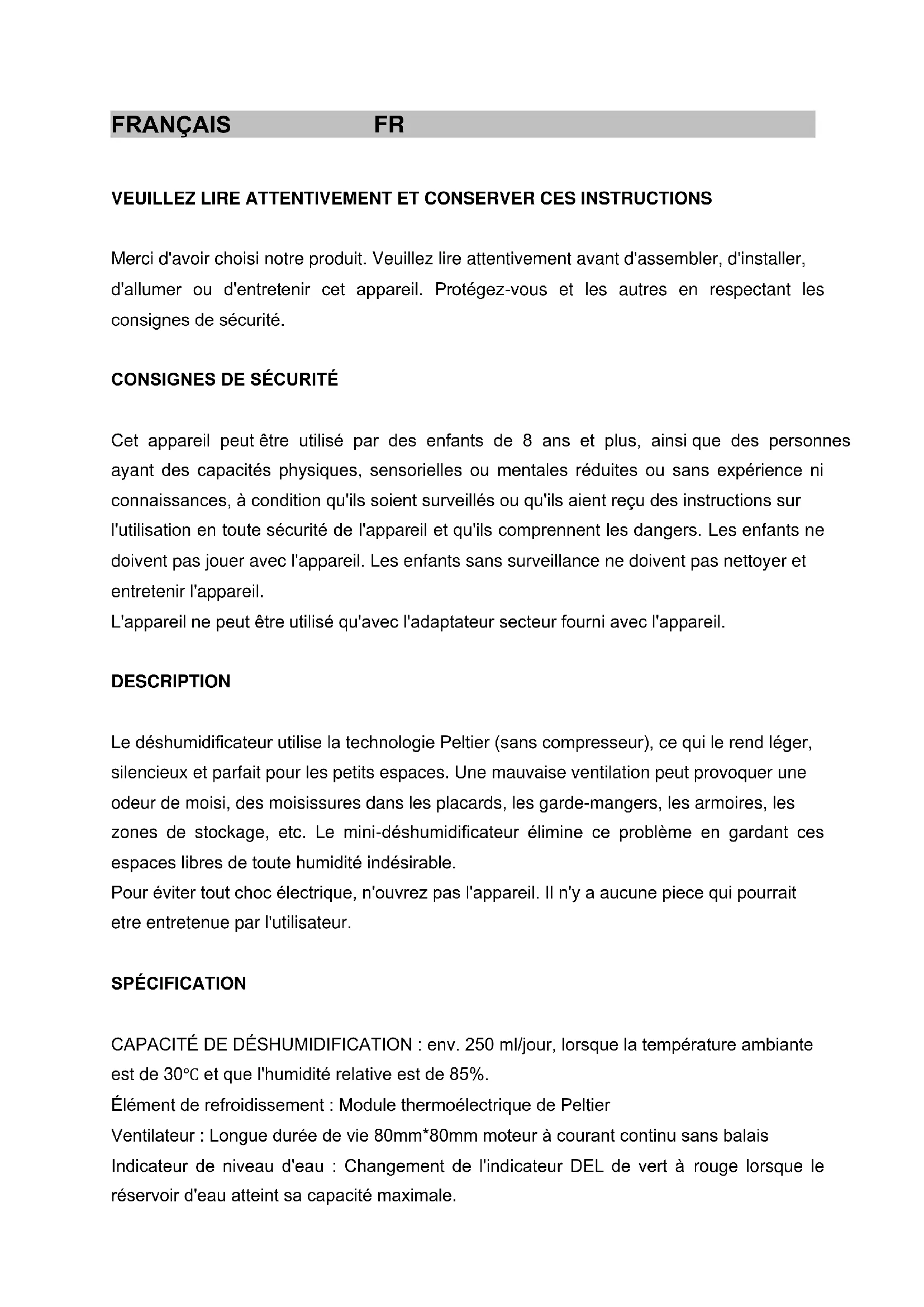 Cet appareil peut être utilisé par des enfants de 8 ans et plus, ainsi que des personnes ayant des capacités physiques, sensorielles ou mentales réduites ou sans expérience ni connaissances, à condition qu'ils soient surveillés ou qu'ils aient reçu des instructions sur l'utilisation en toute sécurité de l'appareil et qu'ils comprennent les dangers. Les enfants ne doivent pas jouer avec l'appareil. Les enfants sans surveillance ne doivent pas nettoyer et entretenir l'appareil. L'appareil ne peut être utilisé qu'avec l'adaptateur secteur fourni avec l'appareil. DESCRIPTION Le déshumidificateur utilise la technologie Peltier (sans compresseur), ce qui le rend léger, silencieux et parfait pour les petits espaces. Une mauvaise ventilation peut provoquer une odeur de moisi, des moisissures dans les placards, les garde-mangers, les armoires, les zones de stockage, etc. Le mini-déshumidificateur élimine ce problème en gardant ces espaces libres de toute humidité indésirable. Pour éviter tout choc électrique, n'ouvrez pas l'appareil. Il n'y a aucune piece qui pourrait etre entretenue par l'utilisateur. SPÉCIFICATION CAPACITÉ DE DÉSHUMIDIFICATION : env. 250 ml/jour, lorsque la température ambiante est de 30℃ et que l'humidité relative est de 85%. Élément de refroidissement : Module thermoélectrique de Peltier Ventilateur : Longue durée de vie 80mm*80mm moteur à courant continu sans balais Indicateur de niveau d'eau : Changement de l'indicateur DEL de vert à rouge lorsque le réservoir d'eau atteint sa capacité maximale.10 Arrêt automatique : Lorsque le réservoir d'eau atteint sa capacité maximale, le déshumidificateur s'arrête automatiquement. Dimensions du produit: 154mm*130mm*220mm Environnement de travail recommandé : Température : plus de 15 ℃. Humidité : plus de 40 % d'humidité relative. Meilleur environnement de travail : Température : 30 ℃. Humidité : plus de 85 % d'humidité relative. L'ALIMENTATION CA/CC SERA CHAUDE PENDANT L'UTILISATION. CECI EST NORMAL ET N'INDIQUE PAS UN DÉFAUT. SI L'APPAREIL FONCTIONNE EN DESSOUS DE LA TEMPÉRATURE OU DE L'HUMIDITÉ RECOMMANDÉE, LE DÉSHUMIDIFICATEUR ABSORBE L'HUMIDITÉ PLUS LENTEMENT.