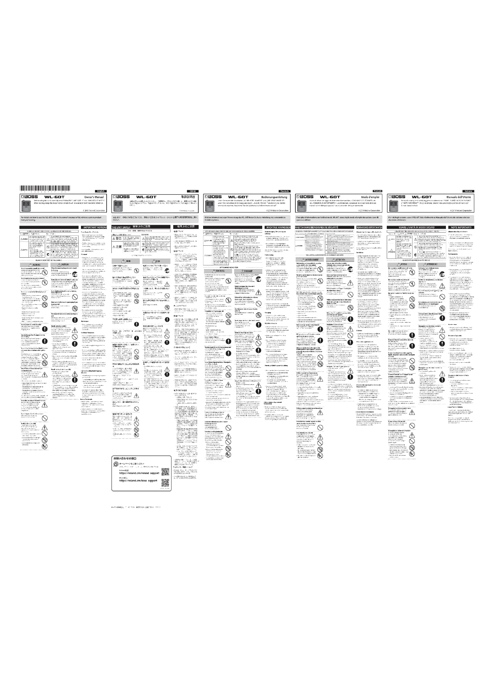 Compliance Information Statement Model Name :Type of Equipment :Responsible Party :Address :Telephone :WL-60TWIRELESS TRANSMITTERRoland Corporation U.S.5100 S. Eastern Avenue Los Angeles, CA 90040-2938(323) 890-3700For EU CountriesEuropean Community Declaration of ConformityEnglish Hereby, Roland Corporation declares that the radio equipment type wireless transmitter is in compliance with Directive 2014/53/EU. The full text of the EU declaration of conformity is available at the following internet address.BulgarianС настоящото Roland Corporation декларира, че радиосъоръженията от типа безжичен предавател са в съответствие с Директива 2014/53/ЕС.Цялостният текст на ЕС декларацията за съответствие може да се намери на следния интернет адрес.Czech Společnost Roland Corporation tímto prohlašuje, že bezdrátový vysílač rádiového typu splňuje požadavky směrnice 2014/53/EU. Úplné znění EU prohlášení o shodě je k dispozici na této internetové adrese.Danish Roland Corporation erklærer hermed, at radioudstyret med trådløs transmitter er i overensstemmelse med direktiv 2014/53/EU. EU-overensstemmelseserklæringens fulde tekst kan ndes på følgende internetadresse.GermanRoland Corporation versichert hiermit, dass der Drahtlos-Sender der Verordnung 2014/53/EU entspricht.Der vollständige Text der EU-Konformitätserklärung ist unter der folgenden Internetadresse verfügbar.Estonian Käesolevaga deklareerib Roland Corporation, et käesolev raadioseadme tüüp juhtmeta saatja vastab Euroopa Parlamendi ja nõukogu direktiivi 2014/53/EL nõuetele.ELi vastavusdeklaratsiooni täielik tekst on kättesaadav järgmisel internetiaadressil.GreekΔια του παρόντος, η Roland Corporation δηλώνει ότι ο ασύρματος πομπός του ραδιοεξοπλισμού συμμορφώνονται με την οδηγία 2014/53/ΕΕ.Το πλήρες κείμενο της δήλωσης συμμόρφωσης ΕΕ διατίθεται στην ακόλουθη ιστοσελίδα στο διαδίκτυο.Spanish Por la presente, Roland Corporation declara que el equipo de radio de transmisión inalámbrica cumple con la Directiva 2014/53/UE. El texto completo de la declaración UE de conformidad está disponible en la dirección Internet siguiente.French Par la présente, Roland Corporation déclare que l’émetteur sans l est conforme à la Directive 2014/53/UE sur les équipements radio. Le texte complet de la déclaration UE de conformité est disponible à l’adresse internet suivante.ItalianRoland Corporation dichiara che il dispositivo radio trasmettitore wireless è conforme alla Direttiva 2014/53/UE.Il testo completo della dichiarazione di conformità UE è disponibile al seguente indirizzo Internet.Latvian Ar šo „Roland Corporation” paziņo, ka radioiekārtas tipa bezvadu raidītājs atbilst Direktīvai 2014/53/ES. Pilns ES atbilstības deklarācijas teksts ir pieejams šādā interneta vietnē.Lithuanian Šiuo „Roland Corporation“ patvirtina, kad radijo įrangos tipo belaidis siųstuvas atitinka direktyvą 2014/53/ES. Visas ES atitikties deklaracijos tekstas prieinamas šiuo interneto adresu.CroatianOvime tvrtka Roland Corporation izjavljuje da je bežični radijski prijenosnik u skladu s Direktivom 2014/53/EU.Cjeloviti tekst EU izjave o sukladnosti dostupan je na sljedećoj internetskoj adresi.Hungarian A Roland Corporation ezennel kijelenti, hogy a rádióberendezés jellegű vezeték nélküli adó megfelel a 2014/53/EU irányelv előírásainak. Az EU-megfelelőségi nyilatkozat teljes szövege elérhető a következő internetes címen.Maltese B’dan, ir-Roland Corporation tiddikjara li t-tagħmir tar-radju tat-tip trażmettitur bla li huwa konformi mad-Direttiva 2014/53/UE. It-test kollu tad-dikjarazzjoni ta’ konformità tal-UE huwa disponibbli f’dan l-indirizz tal-Internet li ġej.Dutch Hierbij verklaart Roland Corporation dat het type radioapparatuur draadloze transmitter conform is met Richtlijn 2014/53/EU. De volledige tekst van de EU-conformiteitsverklaring kan worden geraadpleegd op het volgende internetadres.PolishFirma Roland Corporation niniejszym oświadcza, że urządzenia radiowe w postaci nadajnika bezprzewodowego jest zgodne z dyrektywą 2014/53/UE.Pełny tekst deklaracji zgodności UE jest dostępny pod następującym adresem internetowym.Portuguese Através deste documento, a Roland Corporation declara que o transmissor sem o do tipo equipamento de rádio está em conformidade com a Diretiva 2014/53/EU.O texto integral da declaração de conformidade está disponível no seguinte endereço de Internet.Romanian Prin prezenta, Roland Corporation declară că emițătorul fără r tip echipament radio se conformează Directivei 2014/53/UE. Textul integral al declarației UE de conformitate este disponibil la următoarea adresă internet.Slovak Spoločnosť Roland Corporation týmto vyhlasuje, že bezdrôtový vysielač s rádiovým zariadením je v súlade so smernicou 2014/53/EÚ. Úplné EÚ vyhlásenie o zhode je k dispozícii na tejto internetovej adrese.SlovenianDružba Roland Corporation izjavlja, da je brezžični oddajnik radijske opreme skladen z Direktivo 2014/53/EU.Celotno besedilo izjave EU o skladnosti je na voljo na naslednjem spletnem naslovu.FinishRoland Corporation vakuuttaa, että radiolaite tyyppiä langaton lähetin on direktiivin 2014/53/EU mukainen.EU-vaatimustenmukaisuusvakuutuksen täysimittainen teksti on saatavilla seuraavassa internetosoitteessa.SwedishRoland Corporation intygar härmed att radioutrustningen av typen trådlös sändare efterlever EU Direktivet 2014/53/EU.Den fullständiga texten till EU-försäkran om överensstämmelse nns på följande webbadress.The Declaration of Conformity may be consulted in Downloa