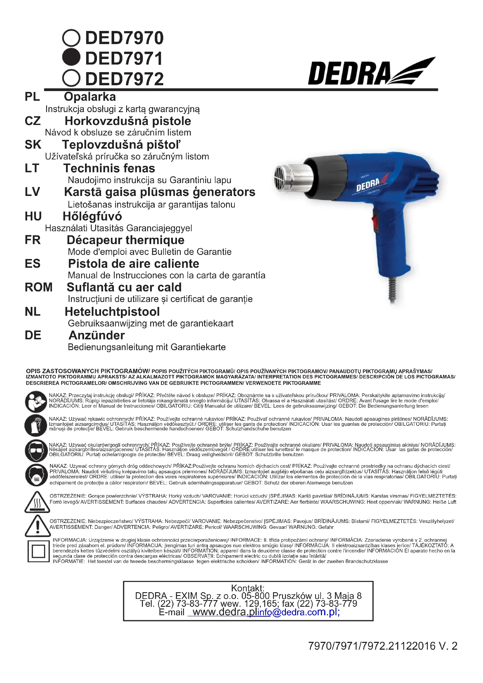 Protection de micanite et élément de chauf f age16 Elément de micanite Protection de micanite et élément de chauf f age17 Douille de micanite Fixation de positionnement18 Douille6 Bague 19 Contacteur Boîtier du v entilateur20 Conduit d’alimentation8 Rotor du v entilateur 22 Pinces9 Base de moteur 23Poignée du conduit d’alimentation Moteur à courant continu26 Condensateur FR16 DEDRA EXIM Sp. z o.o. 05-800 Pruszków ul. 3 Maja 8 tel: (+48 / 22) 73-83-777fax: (+48 / 22) 73-83-779 http: //www . dedra .ple-mail: info@dedra.pl Bulletin de Garantie Cachet vendeurDate et signature ................................................ No catalogue: Nom: Numéro de série: .............................................