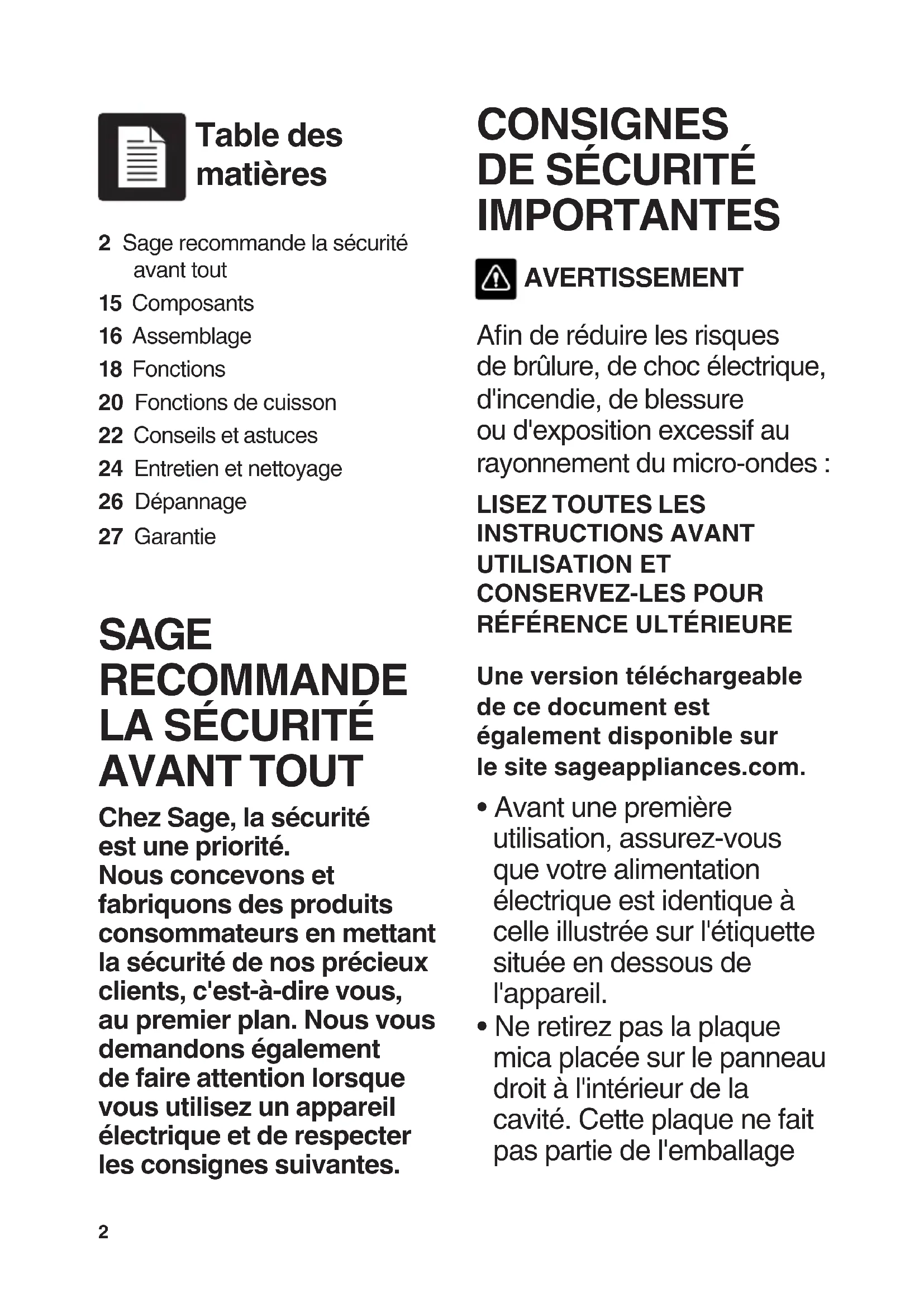 IMPORTANTES AVERTISSEMENT An de réduire les risques de brûlure, de choc électrique, d'incendie, de blessure ou d'exposition excessif au rayonnement du micro-ondes : LISEZ TOUTES LES INSTRUCTIONS AVANT UTILISATION ET CONSERVEZ-LES POUR RÉFÉRENCE ULTÉRIEUREUne version téléchargeable de ce document est également disponible sur le site sageappliances.com.