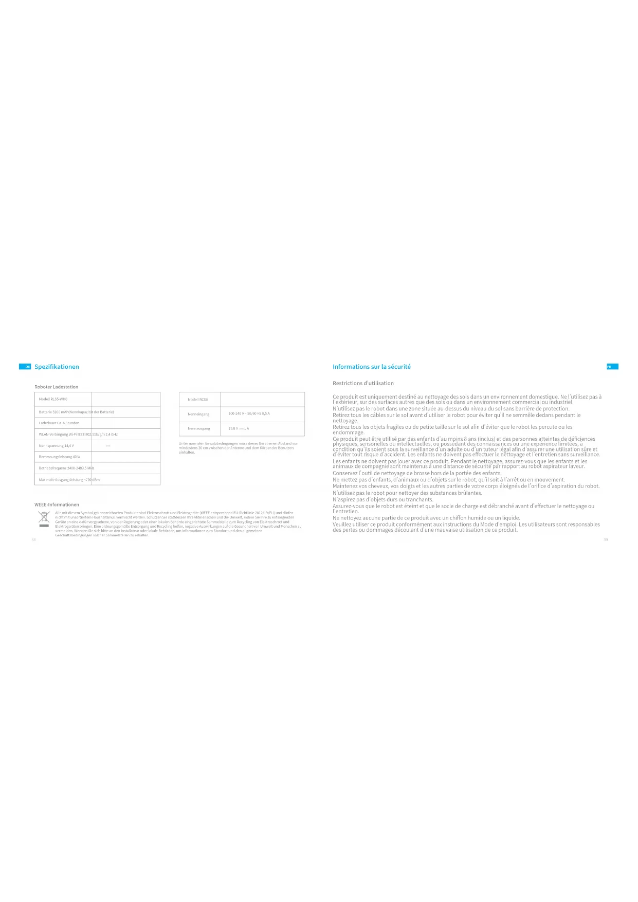 Nenneingang Nennausgang WEEE-Informationen Alle mit diesem Symbol gekennzeichneten Produkte sind Elektroschrott und Elektrogeräte (WEEE entsprechend EU-Richtlinie 2012/19/EU) und dürfen nicht mit unsortiertem Haushaltsmüll vermischt werden. Schützen Sie stattdessen Ihre Mitmenschen und die Umwelt, indem Sie Ihre zu entsorgenden Geräte an eine dafür vorgesehene, von der Regierung oder einer lokalen Behörde eingerichtete Sammelstelle zum Recycling von Elektroschrott und Elektrogeräten bringen. Eine ordnungsgemäße Entsorgung und Recycling helfen, negative Auswirkungen auf die Gesundheit von Umwelt und Menschen zu vermeiden. Wenden Sie sich bitte an den Installateur oder lokale Behörden, um Informationen zum Standort und den allgemeinen Geschäftsbedingungen solcher Sammelstellen zu erhalten. Spezikationen Roboter Ladestation Restrictions d’utilisation Informations sur la sécurité Ce produit est uniquement destiné au nettoyage des sols dans un environnement domestique. Ne l’utilisez pas à l’extérieur, sur des surfaces autres que des sols ou dans un environnement commercial ou industriel. N’utilisez pas le robot dans une zone située au-dessus du niveau du sol sans barrière de protection. Retirez tous les câbles sur le sol avant d’utiliser le robot pour éviter qu’il ne semmêle dedans pendant le nettoyage. Retirez tous les objets fragiles ou de petite taille sur le sol afin d’éviter que le robot les percute ou les endommage. Ce produit peut être utilisé par des enfants d’au moins 8 ans (inclus) et des personnes atteintes de déficiences physiques, sensorielles ou intellectuelles, ou possédant des connaissances ou une expérience limitées, à condition qu'ils soient sous la surveillance d’un adulte ou d’un tuteur légal afin d’assurer une utilisation sûre et d’éviter tout risque d’accident. Les enfants ne doivent pas effectuer le nettoyage et l’entretien sans surveillance. Les enfants ne doivent pas jouer avec ce produit. Pendant le nettoyage, assurez-vous que les enfants et les animaux de compagnie sont maintenus à une distance de sécurité par rapport au robot aspirateur laveur. Conservez l'outil de nettoyage de brosse hors de la portée des enfants. Ne mettez pas d’enfants, d’animaux ou d’objets sur le robot, qu’il soit à l’arrêt ou en mouvement. Maintenez vos cheveux, vos doigts et les autres parties de votre corps éloignés de l’orifice d’aspiration du robot. N’utilisez pas le robot pour nettoyer des substances brûlantes. N’aspirez pas d’objets durs ou tranchants. Assurez-vous que le robot est éteint et que le socle de charge est débranché avant d’effectuer le nettoyage ou l‘entretien. Ne nettoyez aucune partie de ce produit avec un chiffon humide ou un liquide. Veuillez utiliser ce produit conformément aux instructions du Mode d’emploi. Les utilisateurs sont responsables des pertes ou dommages découlant d’une mauvaise utilisation de ce produit. Modell RLS5-WH0 Batterie 5200 mAh(Nennkapazität der Batterie) Ladedauer Ca. 6 Stunden WLAN-Verbingung Wi-Fi IEEE 802,11b/g/n 2,4 GHz Nennspannung 14,4 V Bemessungsleistung 40 W Betriebsfrequenz 2400-2483.5 MHz Maximale Ausgangsleistung <20 dBm40