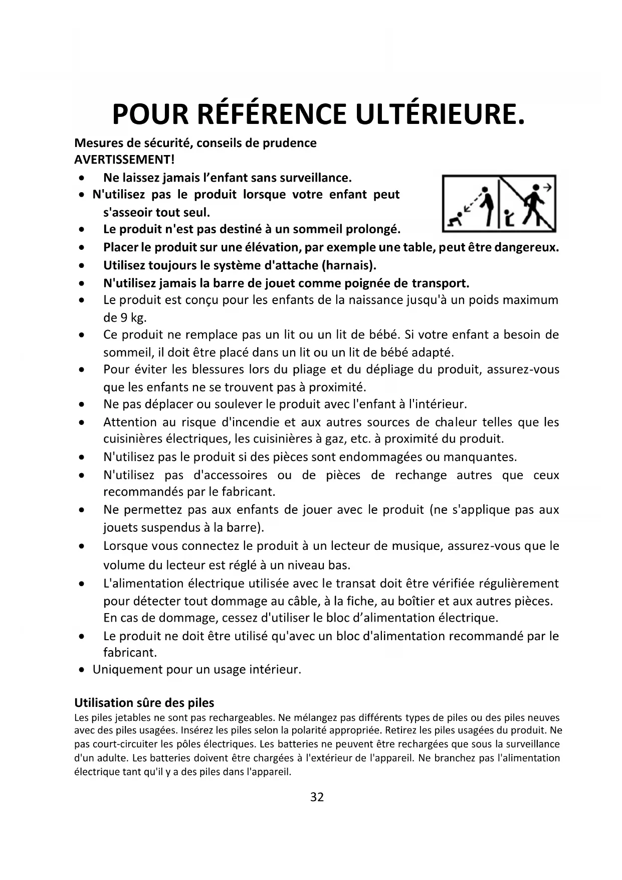 - Ne permettez pas aux enfants de jouer avec le produit (ne s'applique pas aux jouets suspendus à la barre).