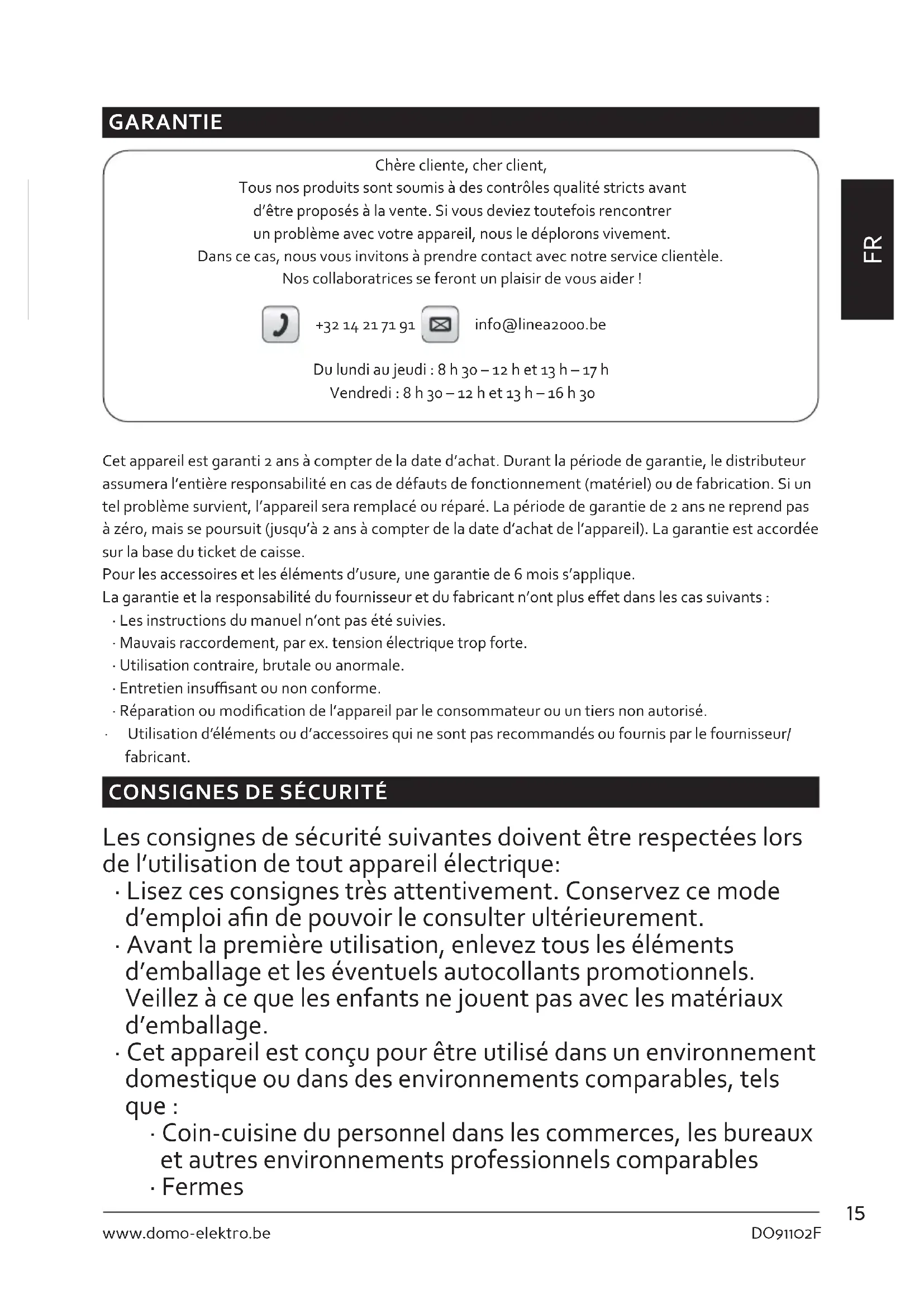 GARANTIE Chère cliente, cher client, Tous nos produits sont soumis à des contrôles qualité stricts avant d’être proposés à la vente. Si vous deviez toutefois rencontrer un problème avec votre appareil, nous le déplorons vivement. Dans ce cas, nous vous invitons à prendre contact avec notre service clientèle. Nos collaboratrices se feront un plaisir de vous aider ! +32 14 21 71 91 info@linea2000.be Du lundi au jeudi : 8 h 30 – 12 h et 13 h – 17 h Vendredi : 8 h 30 – 12 h et 13 h – 16 h 30 Cet appareil est garanti 2 ans à compter de la date d’achat. Durant la période de garantie, le distributeur assumera l’entière responsabilité en cas de défauts de fonctionnement (matériel) ou de fabrication. Si un tel problème survient, l’appareil sera remplacé ou réparé. La période de garantie de 2 ans ne reprend pas à zéro, mais se poursuit (jusqu’à 2 ans à compter de la date d’achat de l’appareil). La garantie est accordée sur la base du ticket de caisse. Pour les accessoires et les éléments d’usure, une garantie de 6 mois s’applique. La garantie et la responsabilité du fournisseur et du fabricant n’ont plus eet dans les cas suivants :