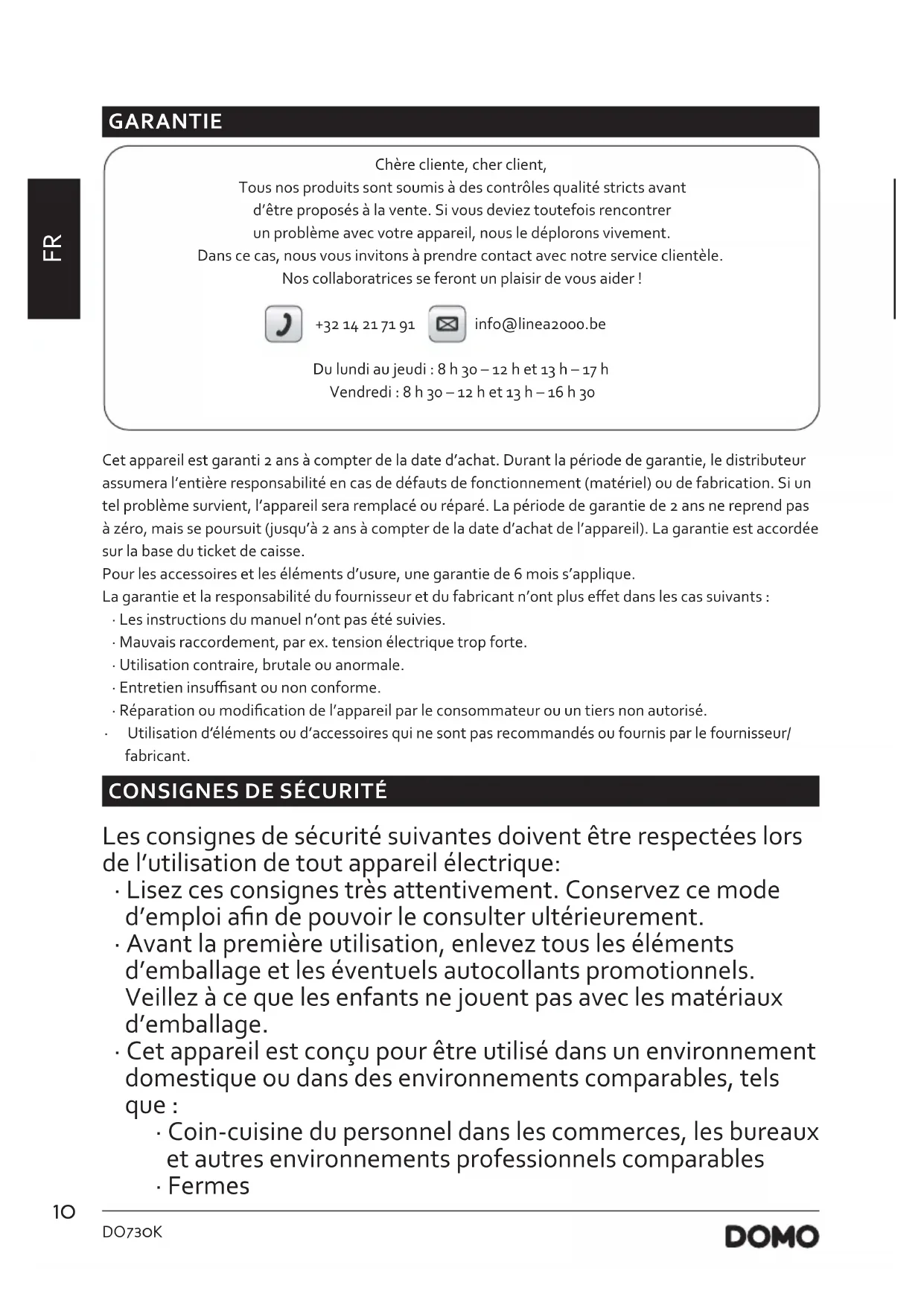 GARANTIE Chère cliente, cher client, Tous nos produits sont soumis à des contrôles qualité stricts avant d’être proposés à la vente. Si vous deviez toutefois rencontrer un problème avec votre appareil, nous le déplorons vivement. Dans ce cas, nous vous invitons à prendre contact avec notre service clientèle. Nos collaboratrices se feront un plaisir de vous aider ! +32 14 21 71 91 info@linea2000.be Du lundi au jeudi : 8 h 30 – 12 h et 13 h – 17 h Vendredi : 8 h 30 – 12 h et 13 h – 16 h 30 Cet appareil est garanti 2 ans à compter de la date d’achat. Durant la période de garantie, le distributeur assumera l’entière responsabilité en cas de défauts de fonctionnement (matériel) ou de fabrication. Si un tel problème survient, l’appareil sera remplacé ou réparé. La période de garantie de 2 ans ne reprend pas à zéro, mais se poursuit (jusqu’à 2 ans à compter de la date d’achat de l’appareil). La garantie est accordée sur la base du ticket de caisse. Pour les accessoires et les éléments d’usure, une garantie de 6 mois s’applique. La garantie et la responsabilité du fournisseur et du fabricant n’ont plus eet dans les cas suivants :