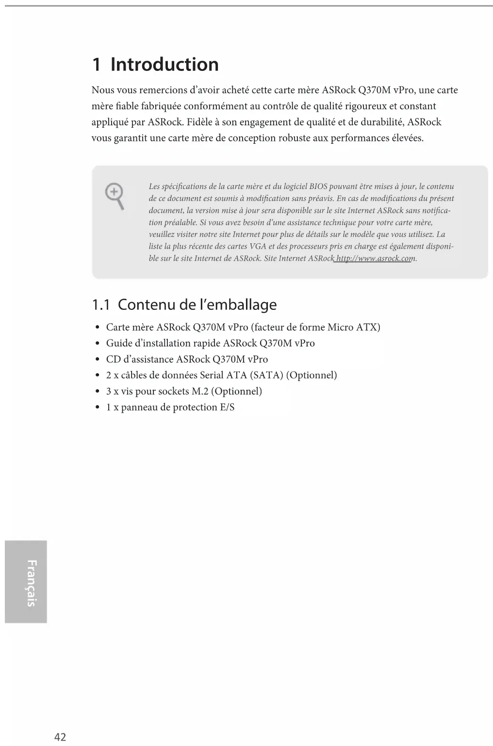 Français 1 Introduction Nous vous remercions d’avoir acheté cette carte mère ASRock Q370M vPro, une carte mère able fabriquée conformément au contrôle de qualité rigoureux et constant appliqué par ASRock. Fidèle à son engagement de qualité et de durabilité, ASRock vous garantit une carte mère de conception robuste aux performances élevées.