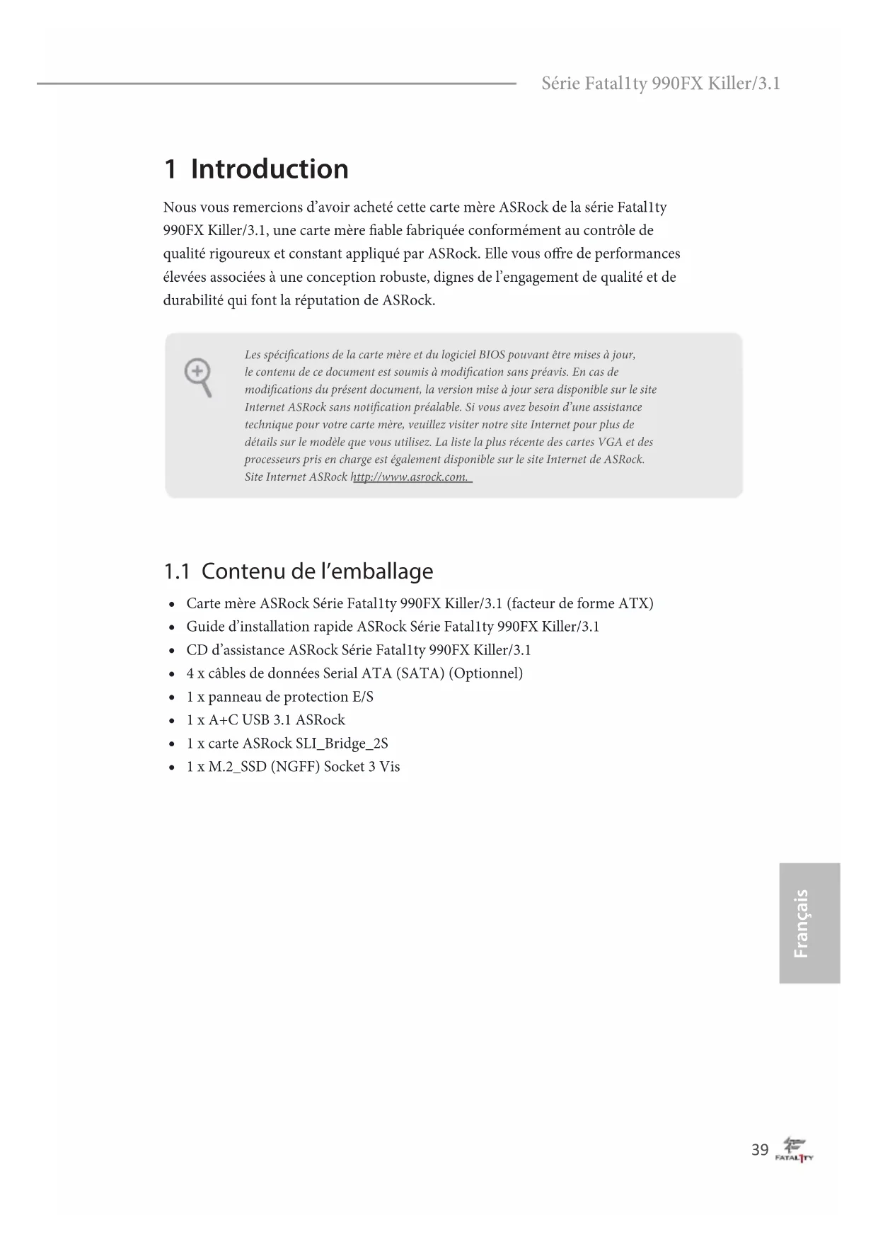 LFRAME#_LCK_33M_TPMTPM_RST#LAD3_L +3V LAD0_L+3VSBGNDF_CLKRUN#SERIRQ#S_PWRDWN# GND LAD1_LLAD2_LSMB_DATA_MA INSMB_CLK_MAIN GND39 Français Série Fatal1ty 990FX Killer/3.1 1 Introduction Nous vous remercions d’avoir acheté cette carte mère ASRock de la série Fatal1ty 990FX Killer/3.1, une carte mère able fabriquée conformément au contrôle de qualité rigoureux et constant appliqué par ASRock. Elle vous ore de performances élevées associées à une conception robuste, dignes de l’engagement de qualité et de durabilité qui font la réputation de ASRock.