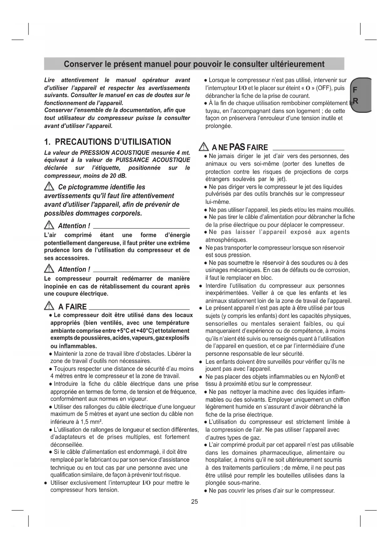 La valeur de PRESSION ACOUSTIQUE mesurée 4 mt. équivaut à la valeur de PUISSANCE ACOUSTIQUE déclarée sur l’étiquette, positionnée sur le compresseur, moins de 20 dB. Ce pictogramme identie les avertissements qu'il faut lire attentivement avant d'utiliser l'appareil, an de prévenir de possibles dommages corporels. Attention ! L’air comprimé étant une forme d’énergie potentiellement dangereuse, il faut prêter une extrême prudence lors de l’utilisation du compresseur et de ses accessoires. Attention ! Le compresseur pourrait redémarrer de manière inopinée en cas de rétablissement du courant après une coupure électrique. A FAIRE ● Le compresseur doit être utilisé dans des locaux appropriés (bien ventilés, avec une température ambiante comprise entre +5°C et +40°C) et totalement exempts de poussières, acides, vapeurs, gaz explosifs ou inammables. ● Maintenir la zone de travail libre d’obstacles. Libérer la zone de travail d’outils non nécessaires. ● Toujours respecter une distance de sécurité d’au moins 4 mètres entre le compresseur et la zone de travail. ● Introduire la che du câble électrique dans une prise appropriée en termes de forme, de tension et de fréquence, conformément aux normes en vigueur. ● Utiliser des rallonges du câble électrique d’une longueur maximum de 5 mètres et ayant une section du câble non inférieure à 1,5 mm². ● L’utilisation de rallonges de longueur et section différentes, d’adaptateurs et de prises multiples, est fortement déconseillée. ● Si le câble d'alimentation est endommagé, il doit être remplacé par le fabricant ou par son service d'assistance technique ou en tout cas par une personne avec une qualication similaire, de façon à prévenir tout risque. ● Utiliser exclusivement l’interrupteur I/O pour mettre le compresseur hors tension. ● Lorsque le compresseur n’est pas utilisé, intervenir sur l’interrupteur I/O et le placer sur éteint « O » (OFF), puis débrancher la che de la prise de courant. ● À la n de chaque utilisation rembobiner complètement le tuyau, en l’accompagnant dans son logement ; de cette façon on préservera l’enrouleur d’une tension inutile et prolongée.