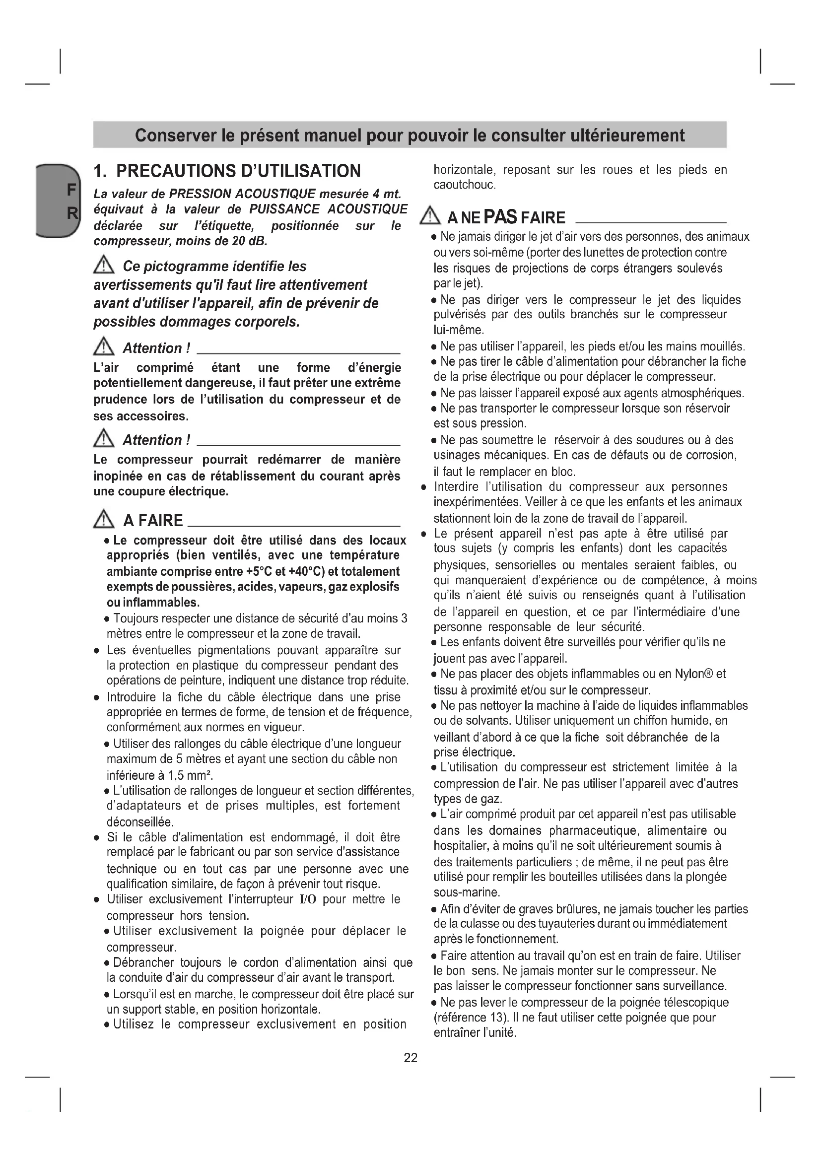 La valeur de PRESSION ACOUSTIQUE mesurée 4 mt. équivaut à la valeur de PUISSANCE ACOUSTIQUE déclarée sur l’étiquette, positionnée sur le compresseur, moins de 20 dB. Ce pictogramme identie les avertissements qu'il faut lire attentivement avant d'utiliser l'appareil, an de prévenir de possibles dommages corporels. Attention ! L’air comprimé étant une forme d’énergie potentiellement dangereuse, il faut prêter une extrême prudence lors de l’utilisation du compresseur et de ses accessoires. Attention ! Le compresseur pourrait redémarrer de manière inopinée en cas de rétablissement du courant après une coupure électrique. A FAIRE ● Le compresseur doit être utilisé dans des locaux appropriés (bien ventilés, avec une température ambiante comprise entre +5°C et +40°C) et totalement exempts de poussières, acides, vapeurs, gaz explosifs ou inammables. ● Toujours respecter une distance de sécurité d’au moins 3 mètres entre le compresseur et la zone de travail. ● Les éventuelles pigmentations pouvant apparaître sur la protection en plastique du compresseur pendant des opérations de peinture, indiquent une distance trop réduite. ● Introduire la che du câble électrique dans une prise appropriée en termes de forme, de tension et de fréquence, conformément aux normes en vigueur. ● Utiliser des rallonges du câble électrique d’une longueur maximum de 5 mètres et ayant une section du câble non inférieure à 1,5 mm². ● L’utilisation de rallonges de longueur et section différentes, d’adaptateurs et de prises multiples, est fortement déconseillée. ● Si le câble d'alimentation est endommagé, il doit être remplacé par le fabricant ou par son service d'assistance technique ou en tout cas par une personne avec une qualication similaire, de façon à prévenir tout risque. ● Utiliser exclusivement l’interrupteur I/O pour mettre le compresseur hors tension. ● Utiliser exclusivement la poignée pour déplacer le compresseur. ● Débrancher toujours le cordon d’alimentation ainsi que la conduite d’air du compresseur d’air avant le transport. ● Lorsqu’il est en marche, le compresseur doit être placé sur un support stable, en position horizontale. ● Utilisez le compresseur exclusivement en position horizontale, reposant sur les roues et les pieds en caoutchouc.