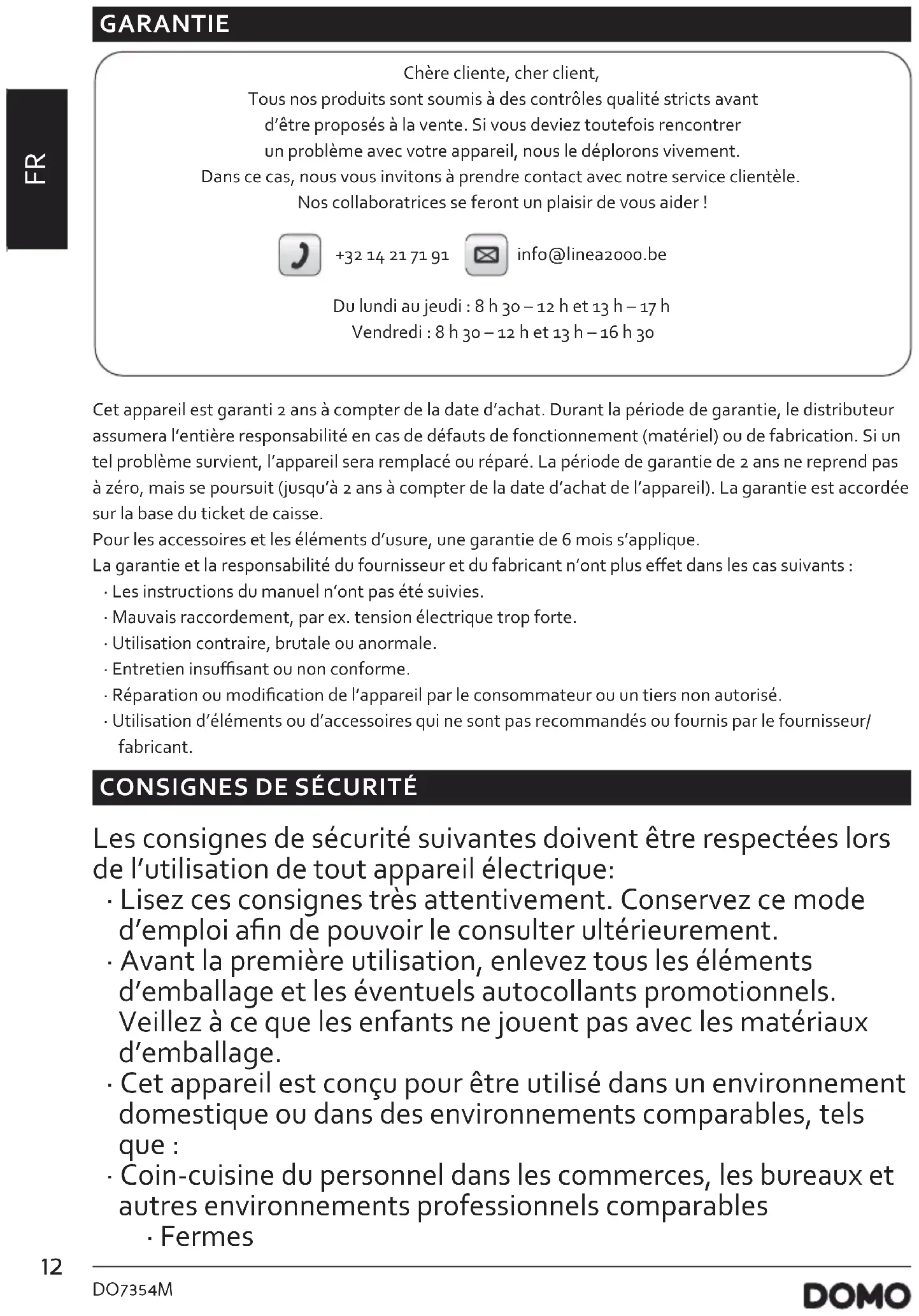 GARANTIE Chère cliente, cher client, Tous nos produits sont soumis à des contrôles qualité stricts avant d’être proposés à la vente. Si vous deviez toutefois rencontrer un problème avec votre appareil, nous le déplorons vivement. Dans ce cas, nous vous invitons à prendre contact avec notre service clientèle. Nos collaboratrices se feront un plaisir de vous aider ! +32 14 21 71 91 info@linea2000.be Du lundi au jeudi : 8 h 30 – 12 h et 13 h – 17 h Vendredi : 8 h 30 – 12 h et 13 h – 16 h 30 Cet appareil est garanti 2 ans à compter de la date d’achat. Durant la période de garantie, le distributeur assumera l’entière responsabilité en cas de défauts de fonctionnement (matériel) ou de fabrication. Si un tel problème survient, l’appareil sera remplacé ou réparé. La période de garantie de 2 ans ne reprend pas à zéro, mais se poursuit (jusqu’à 2 ans à compter de la date d’achat de l’appareil). La garantie est accordée sur la base du ticket de caisse. Pour les accessoires et les éléments d’usure, une garantie de 6 mois s’applique. La garantie et la responsabilité du fournisseur et du fabricant n’ont plus eet dans les cas suivants :