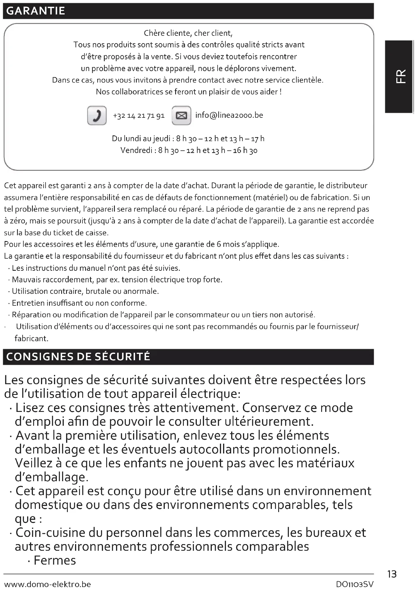 GARANTIE Chère cliente, cher client, Tous nos produits sont soumis à des contrôles qualité stricts avant d’être proposés à la vente. Si vous deviez toutefois rencontrer un problème avec votre appareil, nous le déplorons vivement. Dans ce cas, nous vous invitons à prendre contact avec notre service clientèle. Nos collaboratrices se feront un plaisir de vous aider ! +32 14 21 71 91 info@linea2000.be Du lundi au jeudi : 8 h 30 – 12 h et 13 h – 17 h Vendredi : 8 h 30 – 12 h et 13 h – 16 h 30 Cet appareil est garanti 2 ans à compter de la date d’achat. Durant la période de garantie, le distributeur assumera l’entière responsabilité en cas de défauts de fonctionnement (matériel) ou de fabrication. Si un tel problème survient, l’appareil sera remplacé ou réparé. La période de garantie de 2 ans ne reprend pas à zéro, mais se poursuit (jusqu’à 2 ans à compter de la date d’achat de l’appareil). La garantie est accordée sur la base du ticket de caisse. Pour les accessoires et les éléments d’usure, une garantie de 6 mois s’applique. La garantie et la responsabilité du fournisseur et du fabricant n’ont plus eet dans les cas suivants :