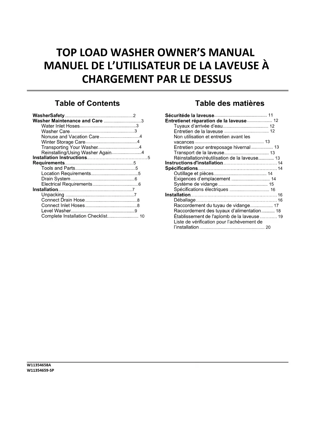 terre Liste de vérification pour l’achèvement de l’installation Consulter les spécifications électriques. S’assurer de disposer d’une source d’électricité appropriée, et d’une liaison à la terre conforme à la méthode recommandée. Vérifier que toutes les pièces sont maintenant installées. S’il reste une pièce, passer en revue les différentes étapes pour découvrir laquelle aurait été oubliée. Vérifier la présence de tous les outils. Vérifier que tout le matériel d’expédition a été retiré de la laveuse. Vérifier que la laveuse est de niveau. Vérifier que les robinets d’eau sont ouverts. Vérifier qu’il n’y a pas de fuite autour des robinets et des tuyaux d’arrivée d’eau. Ôter la pellicule protectrice de la console et tout ruban adhésif resté sur la laveuse. Vérifier que la laveuse est branchée sur une prise de courant à 3 alvéoles reliée à la terre. Éliminer/recycler tous les matériaux d’emballage. Lire la section « Entretien et réparation de la laveuse ». Pour tester et nettoyer la laveuse, mesurer la moitié de la quantité normale recommandée de détergent en poudre ou liquide et la verser dans le panier de la laveuse ou le distributeur de détergent (sur certains modèles). Fermer le couvercle. Sélectionner n’importe quel programme. Mettre la laveuse en marche et la laisser exécuter un programme complet. W11354658A W11354659-SP ®/™ ©2019 All rights reserved. Used under license in Canada.Tous droits réservés. Todos los derechos reservados.Modèles avec pieds en plastique