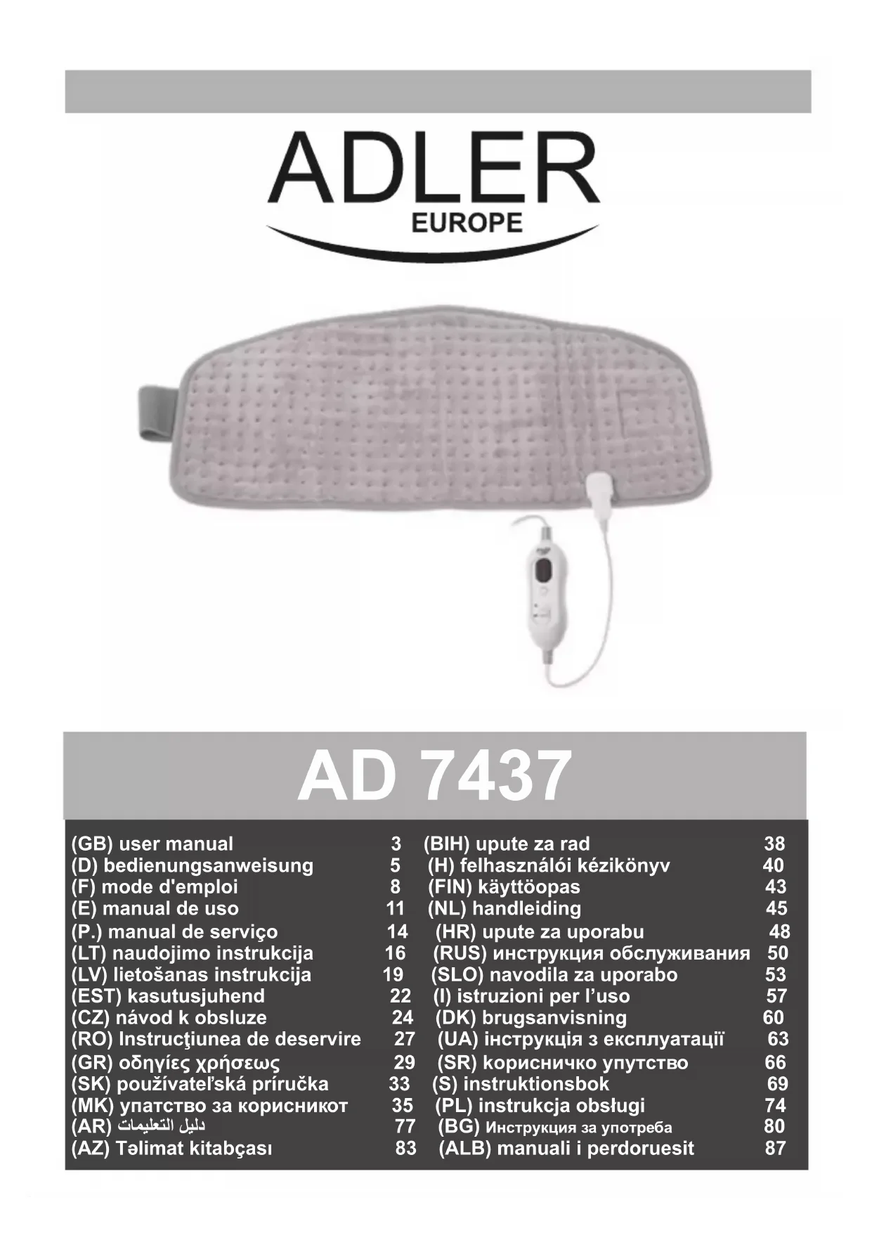 AD 7437 - Couverture/coussin chauffant ADLER - Notice d'utilisation et mode d'emploi gratuit