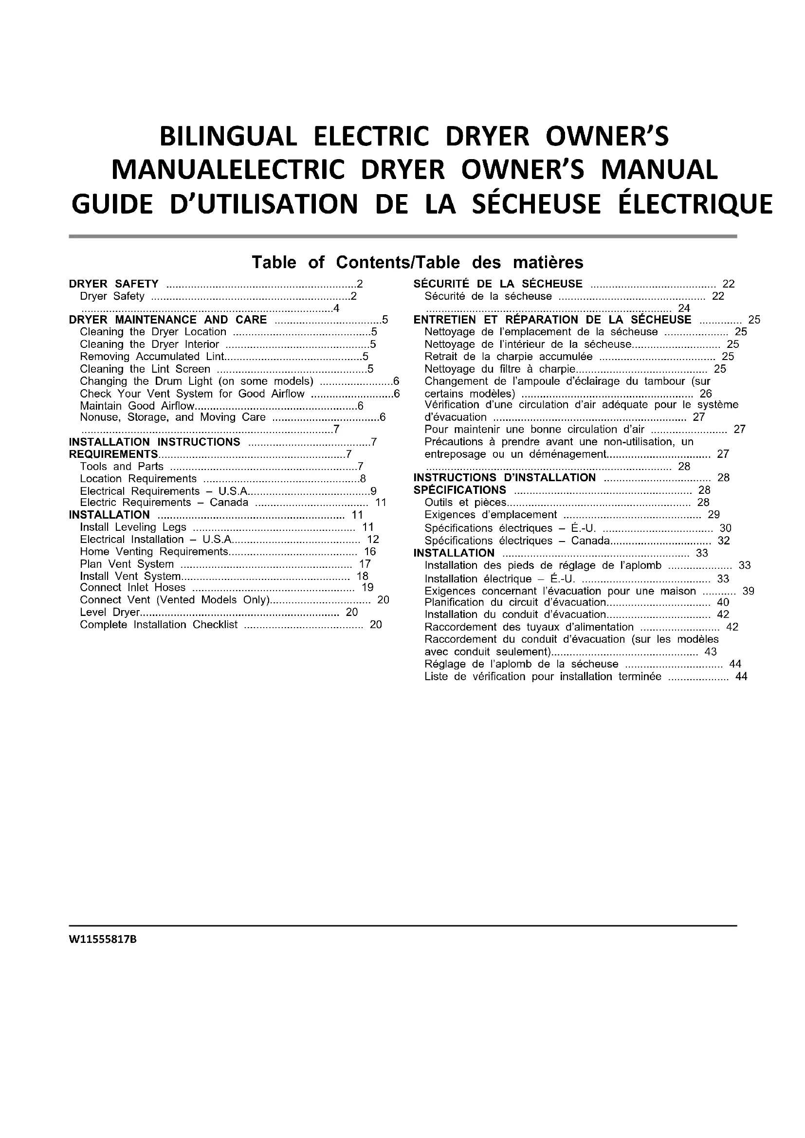 certains modèles) Installation : Placer la jupe au bas de la sécheuse et faire correspondre les goupilles de positionnement avec les trous. Appuyer sur la jupe fermement vers le haut jusqu’à ce qu’elle s’enclenche. Retrait : Dans chaque coin, pousser vers le bas le dessus de la tringle de base. La faire pivoter de la sécheuse, puis la retirer. Liste de vérification pour installation terminée Vérifier que toutes les pièces sont maintenant installées. S’il reste une pièce, passer en revue les différentes étapes pour découvrir laquelle aurait été oubliée. Vérifier la présence de tous les outils. Éliminer/recycler tous les matériaux d’emballage. Vérifier que les robinets d’eau sont ouverts. Vérifier qu’il n’y a pas de fuites autour du raccord en « Y », du robinet et des tuyaux. Vérifier l’emplacement définitif de la sécheuse. S’assurer que le conduit d’évacuation n’est pas écrasé ou déformé. Vérifier que la sécheuse est d’aplomb. Voir la section « Réglage de l’aplomb de la sécheuse ». Ôter la pellicule protectrice de la console et tout ruban adhésif resté sur la sécheuse. Essuyer soigneusement l’intérieur du tambour de la sécheuse avec un chiffon humide pour éliminer toute trace de poussière. Pour une installation avec cordon d’alimentation électrique, brancher dans une prise reliée à la terre. Pour une installation à raccordement direct, mettre l’appareil sous tension. Si l’on réside dans une région où l’eau est dure, l’emploi d’un adoucisseur d’eau est recommandé pour contrôler l’accumulation de tartre dans le circuit d’eau de la sécheuse. Avec le temps, l’accumulation de tartre peut obstruer différentes parties du circuit d’eau, ce qui réduira la performance du produit. Une accumulation excessive de tartre peut entraîner la nécessité de remplacer ou de réparer certains composants. Pour inverser le sens d’ouverture de la porte de la sécheuse, consulter la section « Instructions pour inversion de porte de sécheuse » en ligne. Utiliser un programme avec chaleur de 20 minutes, puis mettre en marche la sécheuse. Ne pas sélectionner le réglage de température Air Only (air seulement). Si la sécheuse ne démarre pas, vérifier ce qui suit : Les commandes sont réglées à la position de marche ou « ON » (marche). On a appuyé fermement sur le bouton Start (mise en marche). La sécheuse est branchée dans une prise ou l’alimentation électrique. Le fusible domestique est intact et bien visé ou le disjoncteur n’est pas ouvert. La porte de la sécheuse est fermée. Après 5 minutes de fonctionnement, ouvrir la porte de la sécheuse et voir s’il y a de la chaleur. Si de la chaleur est détectée, annuler le programme et fermer la porte. Si la sécheuse n’est pas chaude à l’intérieur, éteindre la sécheuse et vérifier ce qui suit : Il peut y avoir 2 fusibles ou disjoncteurs domestiques pour la sécheuse. Vérifier que les deux fusibles sont intacts et bien en place ou que les deux disjoncteurs ne se sont pas déclenchés. S’il n’y a toujours pas de chaleur, contacter un technicien qualifié. REMARQUE : Il est possible que la sécheuse dégage une certaine odeur lorsqu’elle chauffe pour la première fois. Cette odeur est normale lorsque l’élément chauffant est utilisé pour la première fois. L’odeur disparaîtra. Si l’écran de circulation d’air affiche « Check Vent » (vérifier le conduit d’évacuation), il est possible que le conduit d’évacuation de la sécheuse soit écrasé ou bloqué.NOTESNOTESNOTES W11555817B ©2022 All rights reserved. Used under license in Canada. Tous droits réservés. Utilisé sous licence au Canada. 10/22