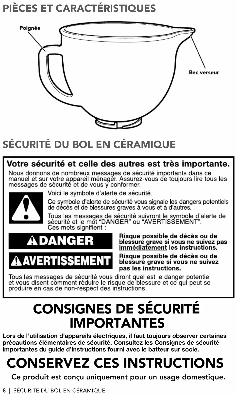 SÉCURITÉ DU BOL EN CÉRAMIQUE Ce produit est conçu uniquement pour un usage domestique. Poignée Bec verseur