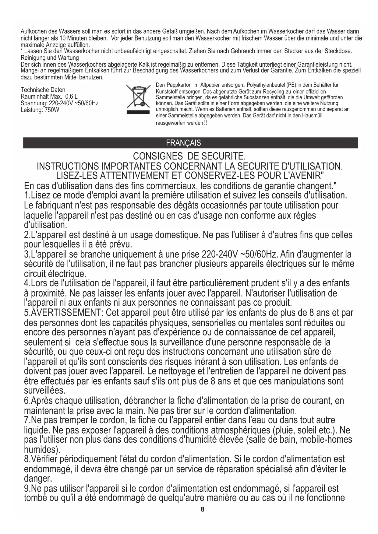 11. La bouilloire est un appareil électrique pas conçu pour contenir de l'eau ou tout autre liquide. Après avoir bouillir l'eau doit être immédiatement verser dans un autre bol. L'eau ne peut pas rester dans la bouilloire plus de 10 minutes après de bouillir. Avant chaque utilisation, remplir la bouilloire avec de l'eau fraîche au-dessus du niveau minimum et au dessous du niveau maximum. Nettoyage et entretien Il faut enlever régulièrement le dépôt calcaire. Cette manipulation n'est pas couverte par la garantie. A défaut d'un détartrage régulier, cela entraînera des dégâts ainsi que la perte de la garantie. Pour détartrer, utiliser des produits prévus expressément à cet effet. Fiche technique: Capacité max: 0,6 L Tension: 220-240V ~50/60Hz Puissance: 750W Respect de l'environnement. Nous vous prions de bien vouloir trier les emballages en carton ainsi que les sachets plastiques (en polyéthylène). L'appareil usagé ne doit pas être jeté à la poubelle mais remis au point de collecte prévu à cet effet car il contient des éléments pouvant être nocifs pour l'environnement. L'appareil électrique doit être remis de manière à limiter au maximum une éventuelle utilisation ultérieure. Si l'appareil contient des piles, il faut les retirer et les remettre à un autre point de collecte. Ne pas jeter l'appareil dans une poubelle de déchets ménagers !!! ESPAÑOL