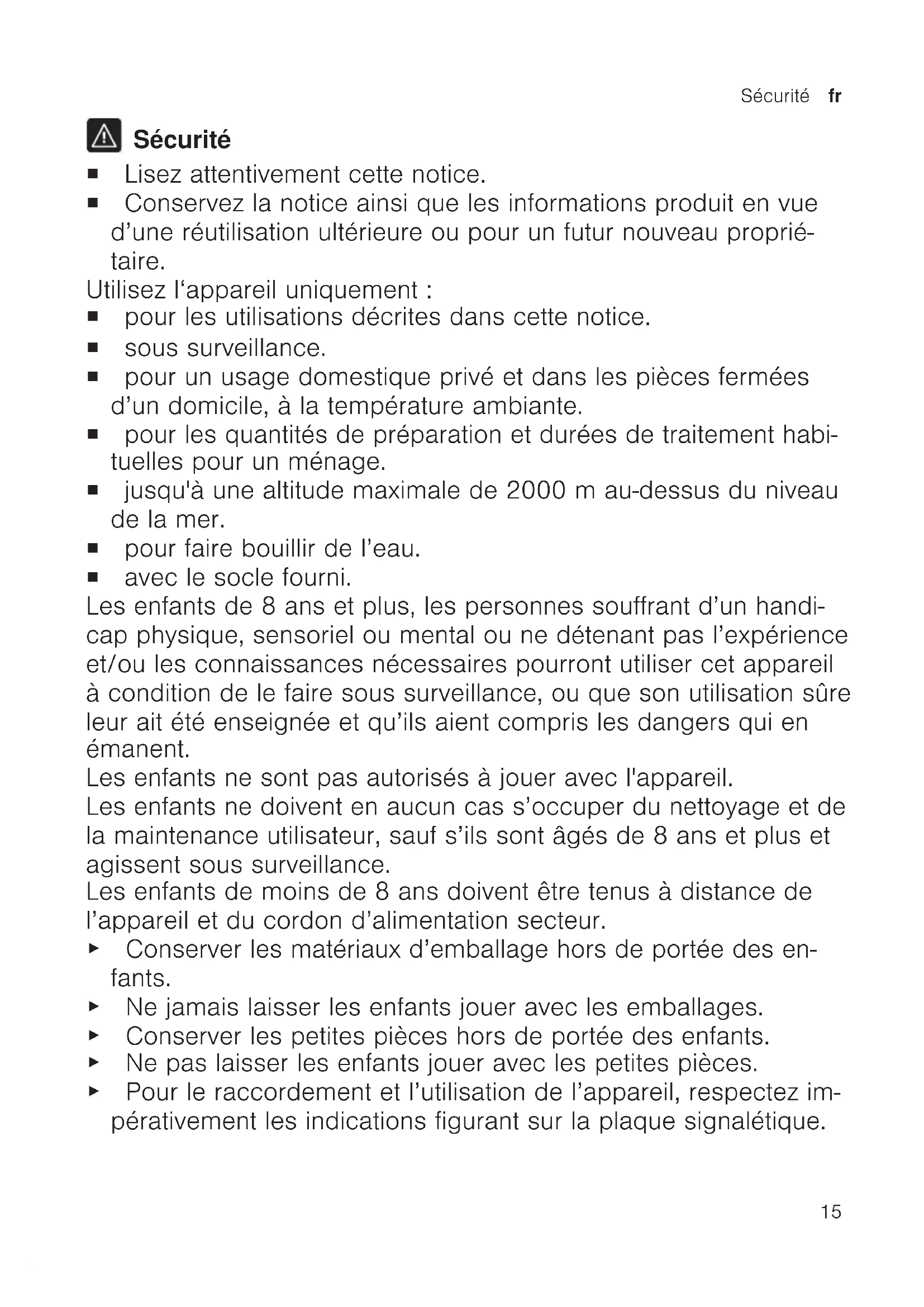 Sécurité ¡ Lisez attentivement cette notice. ¡ Conservez la notice ainsi que les informations produit en vue d’une réutilisation ultérieure ou pour un futur nouveau proprié- taire. Utilisez l‘appareil uniquement: ¡ pour les utilisations décrites dans cette notice. ¡ sous surveillance. ¡ pour un usage domestique privé et dans les pièces fermées d’un domicile, à la température ambiante. ¡ pour les quantités de préparation et durées de traitement habi- tuelles pour un ménage. ¡ jusqu'à une altitude maximale de 2000m au-dessus du niveau de la mer. ¡ pour faire bouillir de l’eau. ¡ avec le socle fourni. Les enfants de 8 ans et plus, les personnes souffrant d’un handi- cap physique, sensoriel ou mental ou ne détenant pas l’expérience et/ou les connaissances nécessaires pourront utiliser cet appareil à condition de le faire sous surveillance, ou que son utilisation sûre leur ait été enseignée et qu’ils aient compris les dangers qui en émanent. Les enfants ne sont pas autorisés à jouer avec l'appareil. Les enfants ne doivent en aucun cas s’occuper du nettoyage et de la maintenance utilisateur, sauf s’ils sont âgés de 8ans et plus et agissent sous surveillance. Les enfants de moins de 8ans doivent être tenus à distance de l’appareil et du cordon d’alimentation secteur. ▶ Conserver les matériaux d’emballage hors de portée des en- fants. ▶ Ne jamais laisser les enfants jouer avec les emballages. ▶ Conserver les petites pièces hors de portée des enfants. ▶ Ne pas laisser les enfants jouer avec les petites pièces. ▶ Pour le raccordement et l’utilisation de l’appareil, respectez im- pérativement les indications figurant sur la plaque signalétique.fr Sécurité