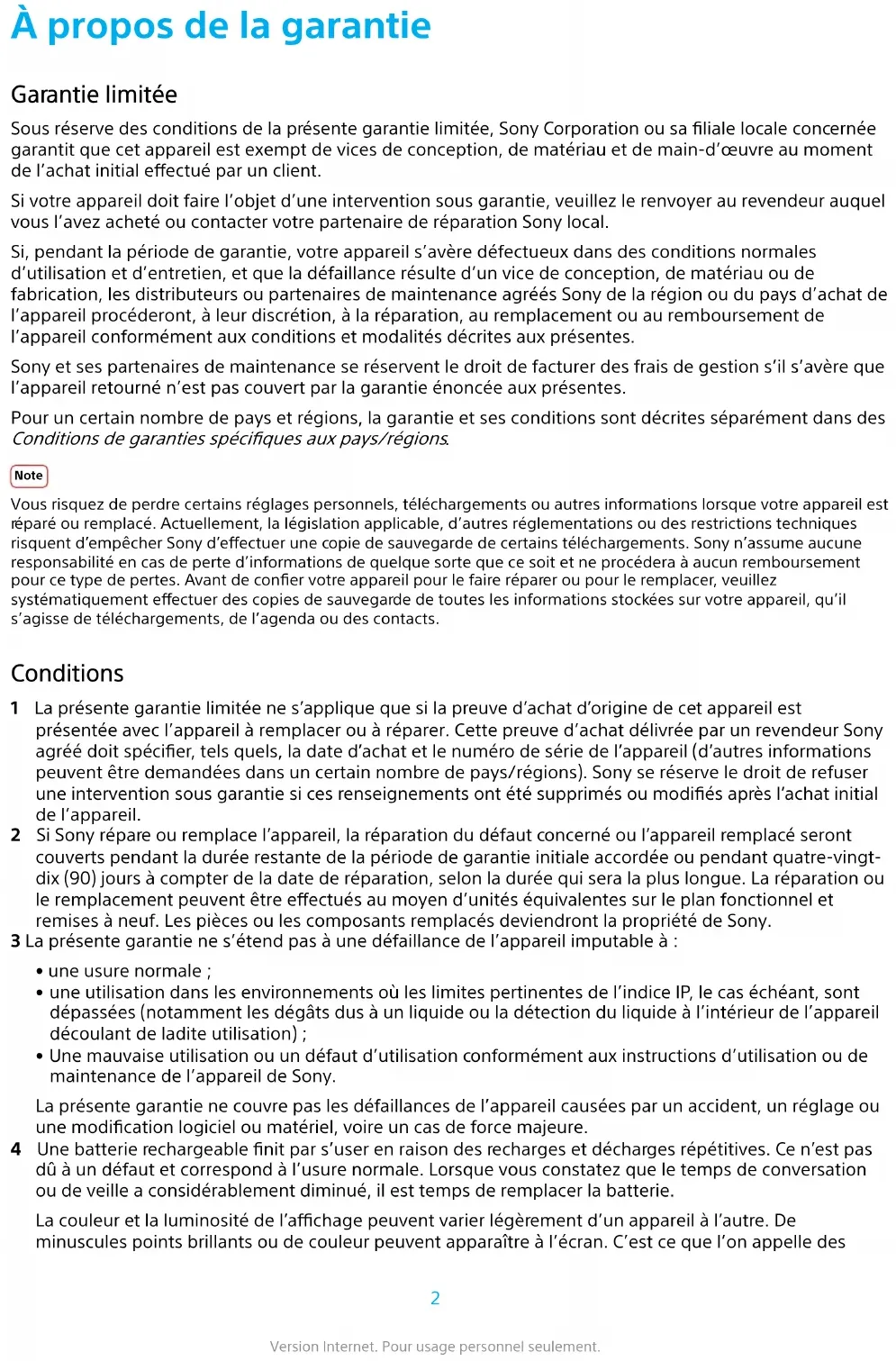 ersion Internet. Pour usage personnel seulement.risquent d’empêcher Sony d ’eectuer une copie de sauvegarde de certains téléchargements. Sony n’assume aucune responsabilité en cas de perte d’informations de quelque sorte que ce soit et ne procédera à aucun remboursement pour ce type de pertes. Avant de coner votre appareil pour le faire réparer ou remplacer, veuillez systématiquement eectuer des copies de sauvegarde de toutes les informations stockées sur votre appareil, qu’il s’agisse de téléchargements, du calendrier ou des contacts. Garantie limitée pour Taïwan Sous réserve des conditions de la présente garantie limitée, Sony Corporation ou sa liale locale concernée garantit que cet appareil est exempt de vices de conception, de matériau et de main-d’œuvre au moment de l’achat initial eectué par un client, et ce, pour une durée d’un (1) an à partir de la date d’achat. Tous les accessoires d’origine livrés avec l’appareil sont garantis pour une période de six (6) mois à compter de la date d’achat. Si, pendant la période de garantie, cet appareil s’avère défectueux dans des conditions normales d’utilisation et d’entretien, et que la défaillance résulte d’un vice de conception, de matériau ou de fabrication, les distributeurs ou partenaires de maintenance agréés Sony de la région ou du pays d’achat de l’appareil produit procéderont, à leur discrétion, à la réparation, au remplacement ou au remboursement de l’appareil conformément aux conditions et modalités stipulées aux présentes. Note Vous risquez de perdre certains réglages personnels, téléchargements ou autres informations lorsque votre appareil est