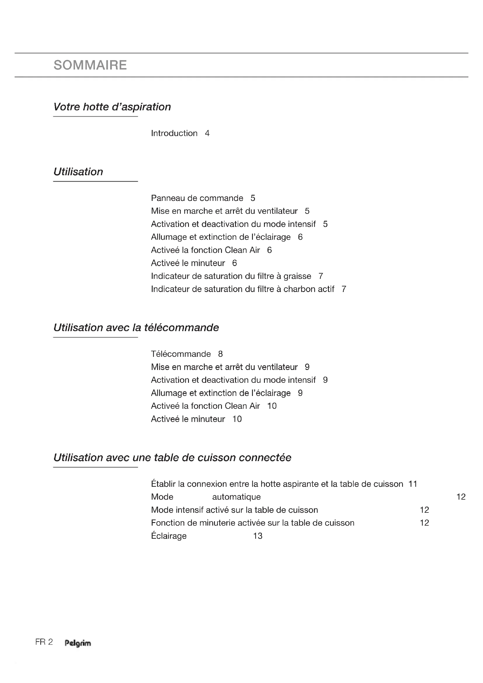 Introduction Nous vous félicitons d’avoir choisi cette hotte d’aspiration Pelgrim. Lasouplesse et la simplicité de l’utilisation sont les principes qui ont guidé son développement. Cette hotte d’aspiration est dotée de la fonctionnalité AutoAir. L’aspiration de la hotte peut alors être commandée de 3 manières différentes via une table de cuisson avec function AutoAir: en mode manuel, semi-automatique et entièrement automatique. Choisissez la manière qui vous convient le mieux. Bien sûr, il est toujours possible d’ajuster les réglages vous-même. Ce mode d’emploi vous explique comment utiliser votre appareil de manière optimale. Il contient des informations relatives au fonctionnement de l’appareil ainsi que des informations d’ordre général susceptibles d’en faciliter l’utilisation. Veuillez lire les consignes de sécurité avant toute utilisation de l’appareil Veuillez lire attentivement ces consignes avant toute utilisation de l’appareil et conservez- les avec l’appareil pour consultation ultérieure. Vous pouvez trouver la version la plus récente de le mode d’emploi sur notre site Web.FR 5 UTILISATION Panneau de commande Les fonctions supplémentaires AutoAir disponibles si une connexion a été établie avec une table de cuisson, sont décrites dans un chapitre séparé (voir «Utilisation avec une table de cuisine connectée»). A B C D E A. Touche d’éclairage et fonction minuterie B. Touche marche / arrêt (Vitesse 1) C. Touche de vitesse 2 et Clean Air function (Air propre) D. Touche de vitesse 3 et mode intensif E. Touche de mode automatique Mise en marche et arrêt du ventilateur