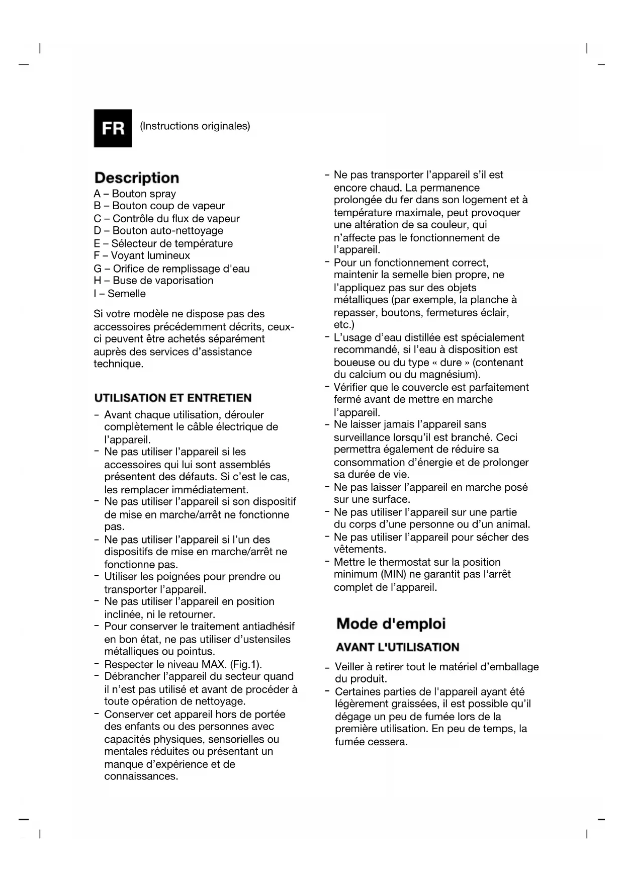 (Instructions originales) A – Bouton spray B – Bouton coup de vapeur C – Contrôle du flux de vapeur D – Bouton auto-nettoyage E – Sélecteur de température F – Voyant lumineux G – Orifice de remplissage d'eau H – Buse de vaporisation I – Semelle Si votre modèle ne dispose pas des accessoires précédemment décrits, ceux- ci peuvent être achetés séparément auprès des services d’assistance technique.