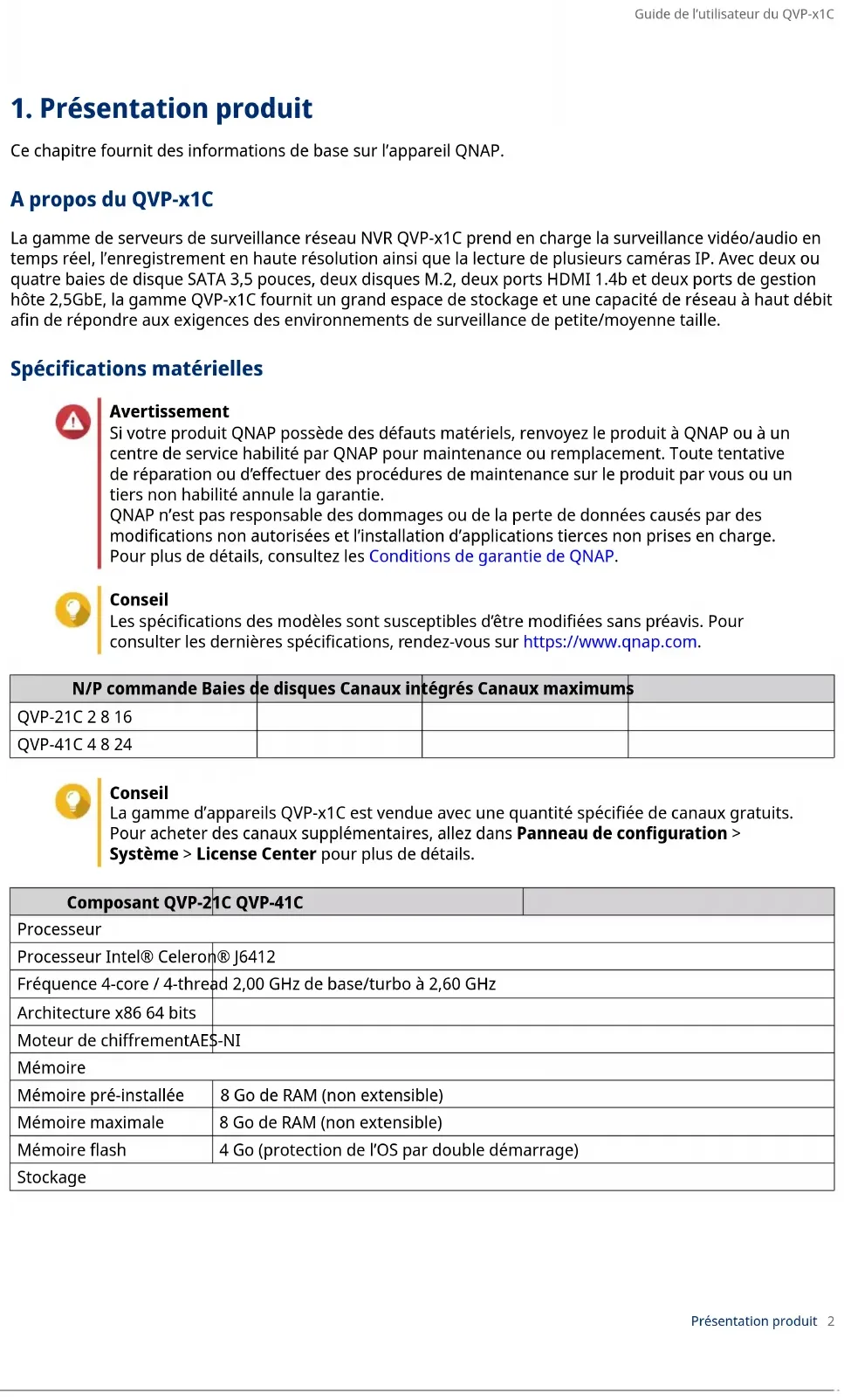 Ce chapitre fournit des informations de base sur l’appareil QNAP. A propos du QVP-x1C La gamme de serveurs de surveillance réseau NVR QVP-x1C prend en charge la surveillance vidéo/audio en temps réel, l’enregistrement en haute résolution ainsi que la lecture de plusieurs caméras IP. Avec deux ou quatre baies de disque SATA 3,5 pouces, deux disques M.2, deux ports HDMI 1.4b et deux ports de gestion hôte 2,5GbE, la gamme QVP-x1C fournit un grand espace de stockage et une capacité de réseau à haut débit an de répondre aux exigences des environnements de surveillance de petite/moyenne taille. Spécications matérielles Avertissement Si votre produit QNAP possède des défauts matériels, renvoyez le produit à QNAP ou à un centre de service habilité par QNAP pour maintenance ou remplacement. Toute tentative de réparation ou d’eectuer des procédures de maintenance sur le produit par vous ou un tiers non habilité annule la garantie. QNAP n’est pas responsable des dommages ou de la perte de données causés par des modications non autorisées et l’installation d’applications tierces non prises en charge. Pour plus de détails, consultez les Conditions de garantie de QNAP. Conseil Les spécications des modèles sont susceptibles d’être modiées sans préavis. Pour consulter les dernières spécications, rendez-vous sur https://www.qnap.com. N/P commande Baies de disques Canaux intégrés Canaux maximums QVP-21C 2 8 16 QVP-41C 4 8 24 Conseil La gamme d’appareils QVP-x1C est vendue avec une quantité spéciée de canaux gratuits. Pour acheter des canaux supplémentaires, allez dans Panneau de conguration > Système > License Center pour plus de détails. Composant QVP-21C QVP-41C Processeur Processeur Intel® Celeron® J6412 Fréquence 4-core / 4-thread 2,00 GHz de base/turbo à 2,60 GHz Architecture x86 64 bits Moteur de chirement AES-NI Mémoire Mémoire pré-installée 8 Go de RAM (non extensible) Mémoire maximale 8 Go de RAM (non extensible) Mémoire ash 4 Go (protection de l’OS par double démarrage) Stockage Guide de l’utilisateur du QVP-x1C Présentation produit 2Composant QVP-21C QVP-41C Baies de disques 2 x disques SATA 6 Gbit/s 3,5 pouces 4 x disques SATA 6 Gbit/s 3,5 pouces Conseil Les baies de disque sont rétrocompatibles avec les disques SATA 3 Gbit/s. Compatibilité des disques Baies de 3,5 pouces :