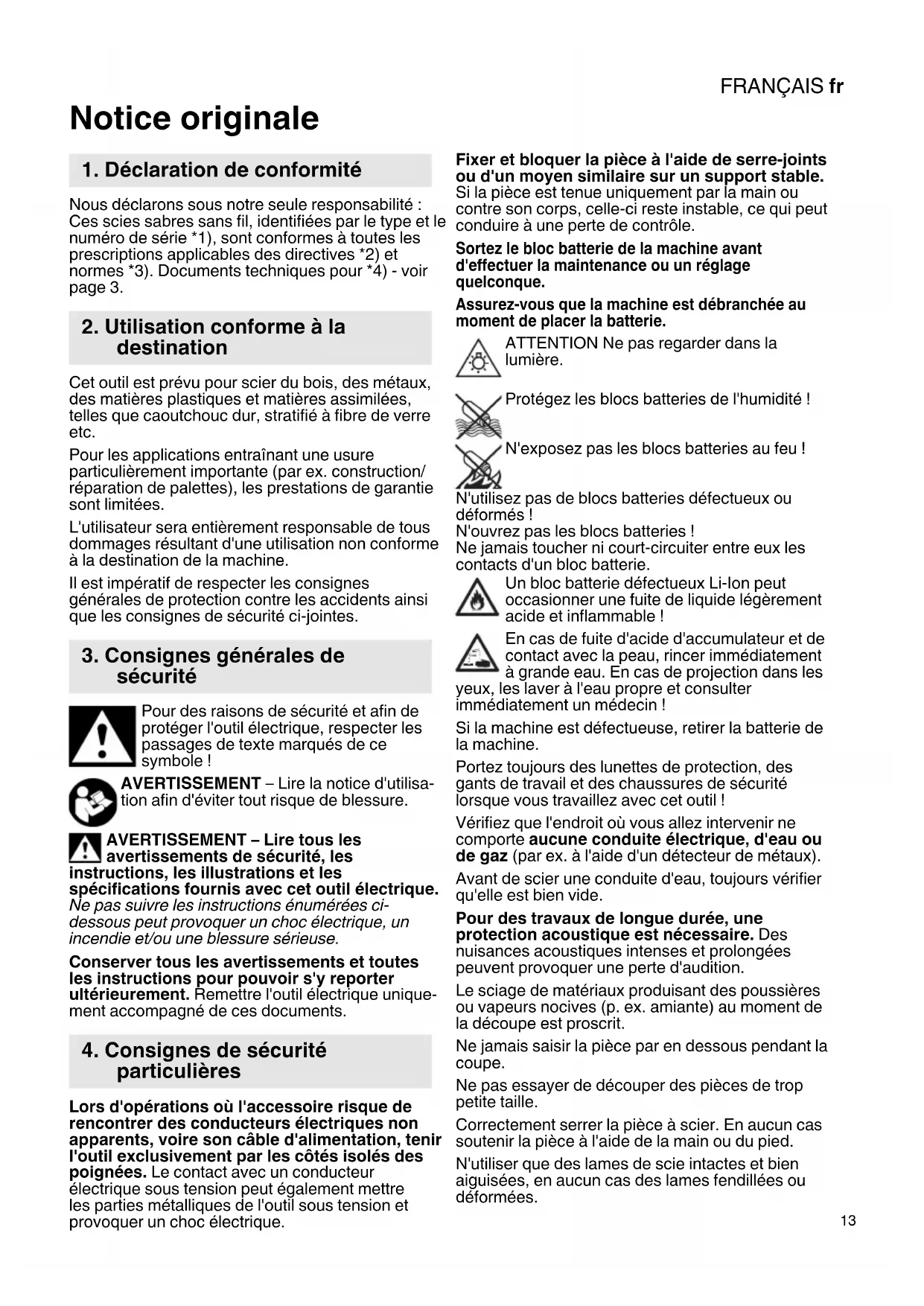 Notice originale Nous déclarons sous notre seule responsabilité : Ces scies sabres sans fil, identifiées par le type et le numéro de série *1), sont conformes à toutes les prescriptions applicables des directives *2) et normes *3). Documents techniques pour *4) - voir page 3. Cet outil est prévu pour scier du bois, des métaux, des matières plastiques et matières assimilées, telles que caoutchouc dur, stratifié à fibre de verre etc. Pour les applications entraînant une usure particulièrement importante (par ex. construction/ réparation de palettes), les prestations de garantie sont limitées. L'utilisateur sera entièrement responsable de tous dommages résultant d'une utilisation non conforme à la destination de la machine. Il est impératif de respecter les consignes générales de protection contre les accidents ainsi que les consignes de sécurité ci-jointes. Pour des raisons de sécurité et afin de protéger l'outil électrique, respecter les passages de texte marqués de ce symbole ! AVERTISSEMENT – Lire la notice d'utilisa- tion afin d'éviter tout risque de blessure. AVERTISSEMENT – Lire tous les avertissements de sécurité, les instructions, les illustrations et les spécifications fournis avec cet outil électrique. Ne pas suivre les instructions énumérées ci- dessous peut provoquer un choc électrique, un incendie et/ou une blessure sérieuse. Conserver tous les avertissements et toutes les instructions pour pouvoir s'y reporter ultérieurement. Remettre l'outil électrique unique- ment accompagné de ces documents. Lors d'opérations où l'accessoire risque de rencontrer des conducteurs électriques non apparents, voire son câble d'alimentation, tenir l'outil exclusivement par les côtés isolés des poignées. Le contact avec un conducteur électrique sous tension peut également mettre les parties métalliques de l'outil sous tension et provoquer un choc électrique. Fixer et bloquer la pièce à l'aide de serre-joints ou d'un moyen similaire sur un support stable. Si la pièce est tenue uniquement par la main ou contre son corps, celle-ci reste instable, ce qui peut conduire à une perte de contrôle. Sortez le bloc batterie de la machine avant d'effectuer la maintenance ou un réglage quelconque. Assurez-vous que la machine est débranchée au moment de placer la batterie. ATTENTION Ne pas regarder dans la lumière. Protégez les blocs batteries de l'humidité ! N'exposez pas les blocs batteries au feu ! N'utilisez pas de blocs batteries défectueux ou déformés ! N'ouvrez pas les blocs batteries ! Ne jamais toucher ni court-circuiter entre eux les contacts d'un bloc batterie. Un bloc batterie défectueux Li-Ion peut occasionner une fuite de liquide légèrement acide et inflammable ! En cas de fuite d'acide d'accumulateur et de contact avec la peau, rincer immédiatement à grande eau. En cas de projection dans les yeux, les laver à l'eau propre et consulter immédiatement un médecin ! Si la machine est défectueuse, retirer la batterie de la machine. Portez toujours des lunettes de protection, des gants de travail et des chaussures de sécurité lorsque vous travaillez avec cet outil ! Vérifiez que l'endroit où vous allez intervenir ne comporte aucune conduite électrique, d'eau ou de gaz (par ex. à l'aide d'un détecteur de métaux). Avant de scier une conduite d'eau, toujours vérifier qu'elle est bien vide. Pour des travaux de longue durée, une protection acoustique est nécessaire. Des nuisances acoustiques intenses et prolongées peuvent provoquer une perte d'audition. Le sciage de matériaux produisant des poussières ou vapeurs nocives (p. ex. amiante) au moment de la découpe est proscrit. Ne jamais saisir la pièce par en dessous pendant la coupe. Ne pas essayer de découper des pièces de trop petite taille. Correctement serrer la pièce à scier. En aucun cas soutenir la pièce à l'aide de la main ou du pied. N'utiliser que des lames de scie intactes et bien aiguisées, en aucun cas des lames fendillées ou déformées.