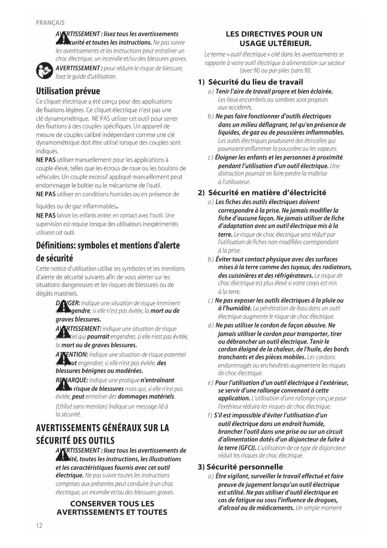 USAGE ULTÉRIEUR. Le terme « outil électrique » cité dans les avertissements se rapporte à votre outil électrique à alimentation sur secteur (avec fil) ou par piles (sansfil).