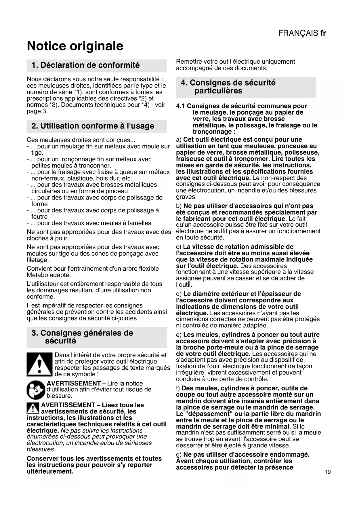 Notice originale Nous déclarons sous notre seule responsabilité : ces meuleuses droites, identifiées par le type et le numéro de série *1), sont conformes à toutes les prescriptions applicables des directives *2) et normes *3). Documents techniques pour *4) - voir page 3. Ces meuleuses droites sont conçues... - ... pour un meulage fin sur métaux avec meule sur tige. - ... pour un tronçonnage fin sur métaux avec petites meules à tronçonner. - ... pour le fraisage avec fraise à queue sur métaux non-ferreux, plastique, bois dur, etc. - ... pour des travaux avec brosses métalliques circulaires ou en forme de pinceau - ... pour des travaux avec corps de polissage de forme - ... pour des travaux avec corps de polissage à feutre - ... pour des travaux avec meules à lamelles Ne sont pas appropriées pour des travaux avec des cloches à polir. Ne sont pas appropriées pour des travaux avec meules sur tige ou des cônes de ponçage avec filetage. Convient pour l'entraînement d'un arbre flexible Metabo adapté. L'utilisateur est entièrement responsable de tous les dommages résultant d'une utilisation non conforme. Il est impératif de respecter les consignes générales de prévention contre les accidents ainsi que les consignes de sécurité ci-jointes. Dans l'intérêt de votre propre sécurité et afin de protéger votre outil électrique, respecter les passages de texte marqués de ce symbole ! AVERTISSEMENT – Lire la notice d'utilisation afin d'éviter tout risque de blessure. AVERTISSEMENT – Lisez tous les avertissements de sécurité, les instructions, les illustrations et les caractéristiques techniques relatifs à cet outil électrique. Ne pas suivre les instructions énumérées ci-dessous peut provoquer une électrocution, un incendie et/ou de sérieuses blessures. Conserver tous les avertissements et toutes les instructions pour pouvoir s'y reporter ultérieurement. Remettre votre outil électrique uniquement accompagné de ces documents.