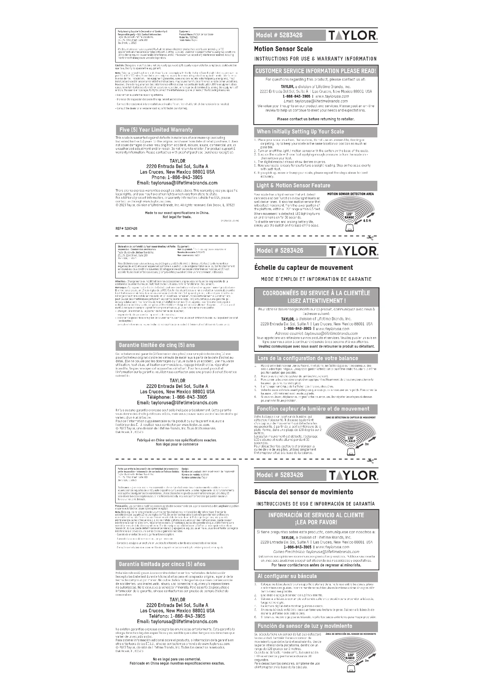 pour une meilleure précision. Échelle du capteur de mouvement Model # 5283426 Lors de la configuration de votre balance COORDONNÉES DU SERVICE À LA CLIENTÈLE LISEZ ATTENTIVEMENT ! TAYLOR, a division of Lifetime Brands, Inc. 2220 Entrada Del Sol, Suite A | Las Cruces, New Mexico 88001 USA1-866-843-3905 | www.taylorusa.comAdresse courriel: taylorusa@lifetimebrands.comNous apprécions vos réflexions sur nos produits et services. Veuillez publier un avis en ligne pour nous aider à continuer à répondre à vos besoins et à vos attentes.Veuillez communiquer avec nous avant de retourner le produit au détaillant. MODE D’EMPLOI ET INFORMATION DE GARANTIE Pour obtenir des renseignements sur ce produit, communiquez avec nous à l’adresse suivant: