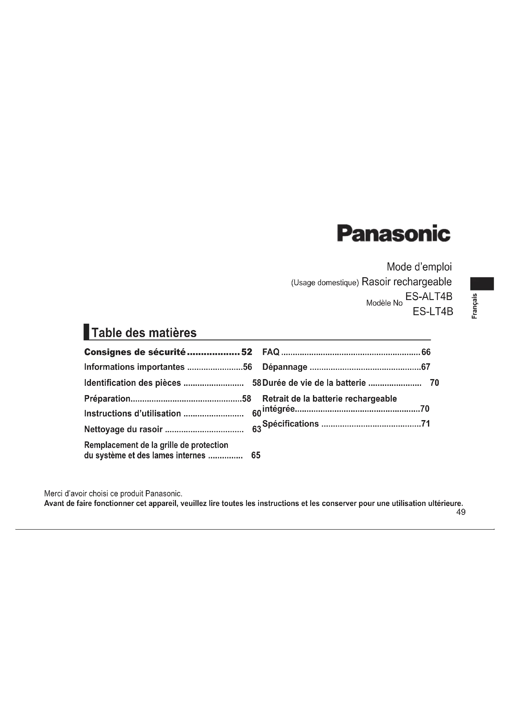 Insérez les lames internes, une par une. ►Remarque Ne jetez pas le cadre de la grille de protection. ►Piècesderemplacement Les pièces de rechange sont disponibles chez votre marchand ou dans votre centre de service après‑vente. Pièces de remplacement pour ES‑ALT4B/ES‑LT4B Grille de protection du système et lames internes WES9013 Grille de protection du système WES9087 Lames internes WES9068 Huile de lubrication WES003P FAQ Question Réponse La batterie se détériorera‑t‑elle si elle n’est pas utilisée pendant une période prolongée ? La batterie se détériorera si elle n’est pas utilisée pendant plus de 6 mois. Par conséquent assurez‑vous de charger complètement l’appareil au moins une fois tous les 6 mois. Puis‑je charger le rasoir après chaque utilisation ? La batterie utilisée est une batterie au Lithium‑Ion. Par conséquent charger la batterie après chaque utilisation n’aectera pas sa durée de vie. Pourquoi l’adaptateur doit‑il être débranché après une recharge ? Chargez la batterie durant plus d’une heure n’aectera pas la performance de la batterie, mais débranchez l’adaptateur par sécurité ainsi que pour économiser l’énergie. Quels sont les constituants de l’huile dédiée ? L’huile est constituée de parane liquide. Pourquoi l’appareil sonne‑t‑il deux fois une fois éteint ? Le son indique que le niveau de la batterie est faible. Veuillez charger l’appareil.67 Français Dépannage Procédez comme suit. Si vous ne parvenez toujours pas à résoudre les problèmes, contactez le magasin où vous avez acheté l’unité ou un centre de service autorisé par Panasonic pour le produit. Problème Action Le rasoir ne se met pas en marche en activant le bouton de mise en marche. Déverrouillez le bouton de mise en marche. (Voir page 63.) L’appareil sera mis à l’ARRÊT. Appuyez deux fois sur le bouton de mise en marche lorsque vous utilisez le mode mousse à raser. Problème Action Le capteur de barbe ne répond pas. Selon l’épaisseur de la barbe ou la quantité de poils de barbe présents dans la tête du rasoir, le capteur de barbe peut ne pas réagir et le bruit du moteur peut ne pas changer. Il ne s’agit pas d’un dysfonctionnement. Le capteur de barbe peut ne pas répondre en fonction du type et de la quantité du gel de rasage. Ceci n’est pas anormal. Le capteur de barbe peut ne pas répondre lorsque le niveau de batterie restant est faible. Dans ce cas, rechargez le rasoir. Appliquez de l’huile. (Voir page 64.) Le capteur de barbe peut ne pas répondre s’il n’y a pas assez d’huile sur les lames.68 Français Problème Action Le capteur de barbe répond malgré le faite que le rasoir n’est pas en contact avec la peau. Nettoyez les poils de barbes sur le rasoir. Lorsque le rasoir est très sale, utilisez d’abord la brosse de nettoyage pour enlever les poils de barbe. Ou, enlevez le cadre de la grille de protection et lavez‑le avec de l’eau. (Voir page 64.) Remplacez la grille de protection du système et/ou les lames internes. Durée de vie prévue de la grille de protection du système et des lames internes: Grille de protection du système: Environ 1 an Lames internes: Environ 2 ans La mousse ne peut pas être faite en mode mousse à raser. Faire de la mousse peut s’avérer dicile en fonction du type de nettoyant visage, etc., donc ajustez la quantité d’eau ou de nettoyant visage. La mousse faite en mode mousse à raser contient des résidus de rasage. Avant de faire de la mousse, rincez proprement l’appareil an d’éliminer tous les résidus de rasage. (Voir page 63.) Problème Action Le rasoir ne se recharge pas. La température ambiante recommandée pour le chargement est comprise entre 10 °C et 35 °C. En cas de charge à des températures diérentes de celles recommandées, le rasoir peut prendre plus longtemps à charger ou peut ne pas charger du tout. La durée de fonctionnement est courte même après une charge complète. Le rasoir peut être utilisé pendant environ 2 semaines sur un chargement complet en supposant un rasage à sec de 3 minutes par jour. Cependant, le nombre de jours d’utilisation peut être réduit en fonction de l’utilisation du rasoir (par exemple, utilisation en mode mousse à raser, rasage mouillé ou utilisation à basse température). Appliquez de l’huile. Lorsque le nombre d’utilisations par charge commence à diminuer, la batterie est en n de vie.69 Français Problème Action Le rasoir ne fonctionne pas même après chargement. Utilisez cet appareil à une température ambiante de 5 °C ou plus. La batterie a atteint sa n de vie. Le rasoir ne fonctionnera pas avec l’adaptateur CA branché. Veuillez utiliser le rasoir une fois qu’il a été susamment chargé et que l’adaptateur CA a été débranché. Le son du moteur change pendant le rasage. Le capteur de barbe fonctionne. Le bruit varie en fonction de l’épaisseur de la barbe. Produit un bruit important. Appliquez de l’huile. En absence d’huile sur les lames, le rasage ne sera ni optimal ni durable. Le rasoir émet un son aigu à cause du moteur linéaire. Ceci n’indique pas de problème de fonctionnement. Assurez‑vous que les lames sont correctement xées. Nettoyez la grille de protection du système avec la longue brossette. Problème Action L’odeur devient plus forte. Ceci peut être amélioré grâce à un nettoyage systématique après chaque rasage. Les poils rasés s’éparpillent partout. Ceci peut être amélioré grâce à un nettoyage systématique après chaque rasage. Nettoyez les lames internes avec la brossette lorsque les poils rasés collent aux lames internes. Assurez‑vous que le volet de nettoyage est bien fermé. La grille de protection du système chaue. Appliquez de l’huile. Remplacez la grille de protection du système si elle est endommagée ou déformée. (Voir page 65.)70 Français Problème Action Vous n’obtenez pas un rasa