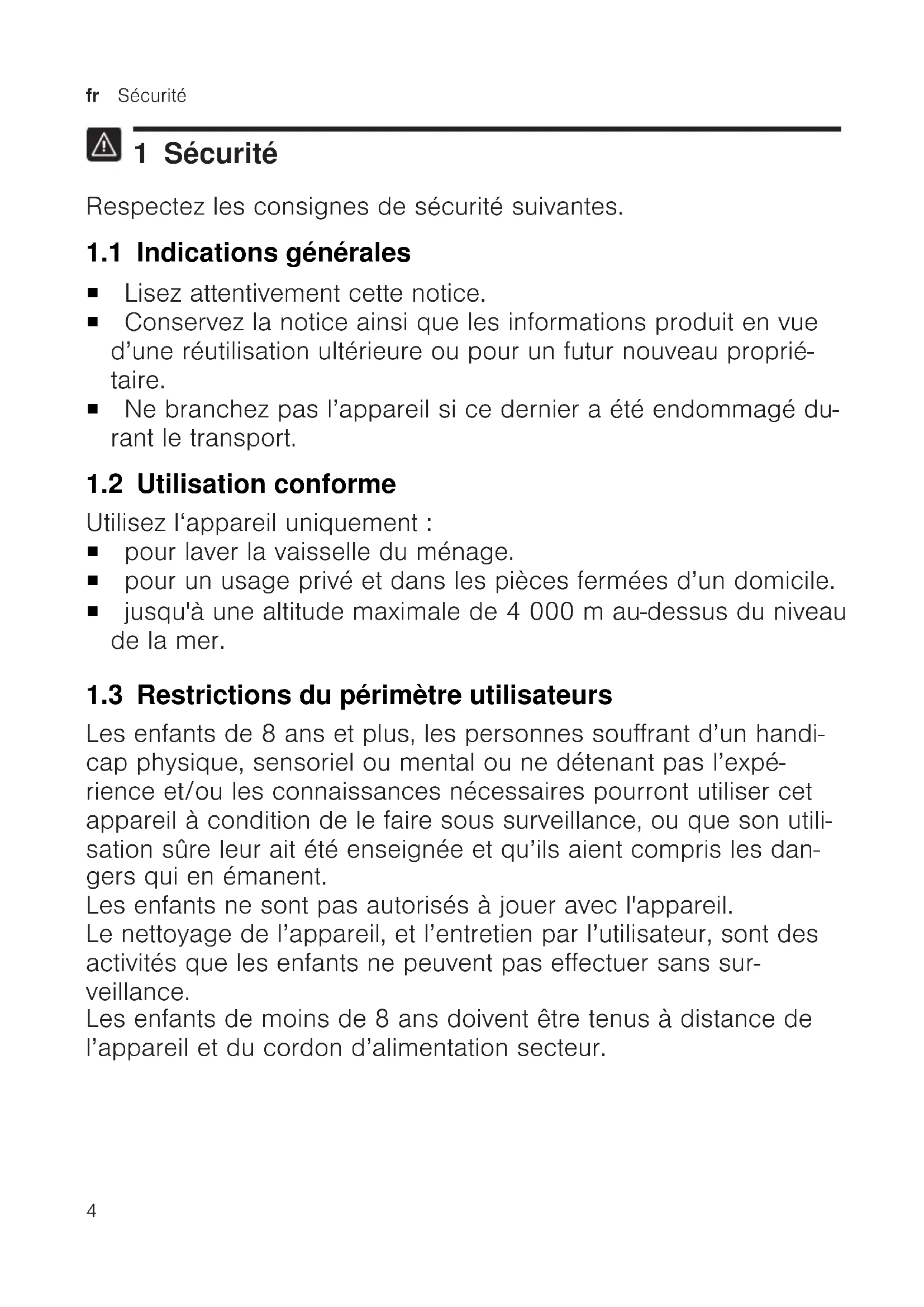 1 Sécurité Respectez les consignes de sécurité suivantes. 1.1 Indications générales ¡ Lisez attentivement cette notice. ¡ Conservez la notice ainsi que les informations produit en vue d’une réutilisation ultérieure ou pour un futur nouveau proprié- taire. ¡ Ne branchez pas l’appareil si ce dernier a été endommagé du- rant le transport. 1.2 Utilisation conforme Utilisez l‘appareil uniquement: ¡ pour laver la vaisselle du ménage. ¡ pour un usage privé et dans les pièces fermées d’un domicile. ¡ jusqu'à une altitude maximale de 4000m au-dessus du niveau de la mer. 1.3 Restrictions du périmètre utilisateurs Les enfants de 8 ans et plus, les personnes souffrant d’un handi- cap physique, sensoriel ou mental ou ne détenant pas l’expé- rience et/ou les connaissances nécessaires pourront utiliser cet appareil à condition de le faire sous surveillance, ou que son utili- sation sûre leur ait été enseignée et qu’ils aient compris les dan- gers qui en émanent. Les enfants ne sont pas autorisés à jouer avec l'appareil. Le nettoyage de l’appareil, et l’entretien par l’utilisateur, sont des activités que les enfants ne peuvent pas effectuer sans sur- veillance. Les enfants de moins de 8ans doivent être tenus à distance de l’appareil et du cordon d’alimentation secteur.Sécurité fr