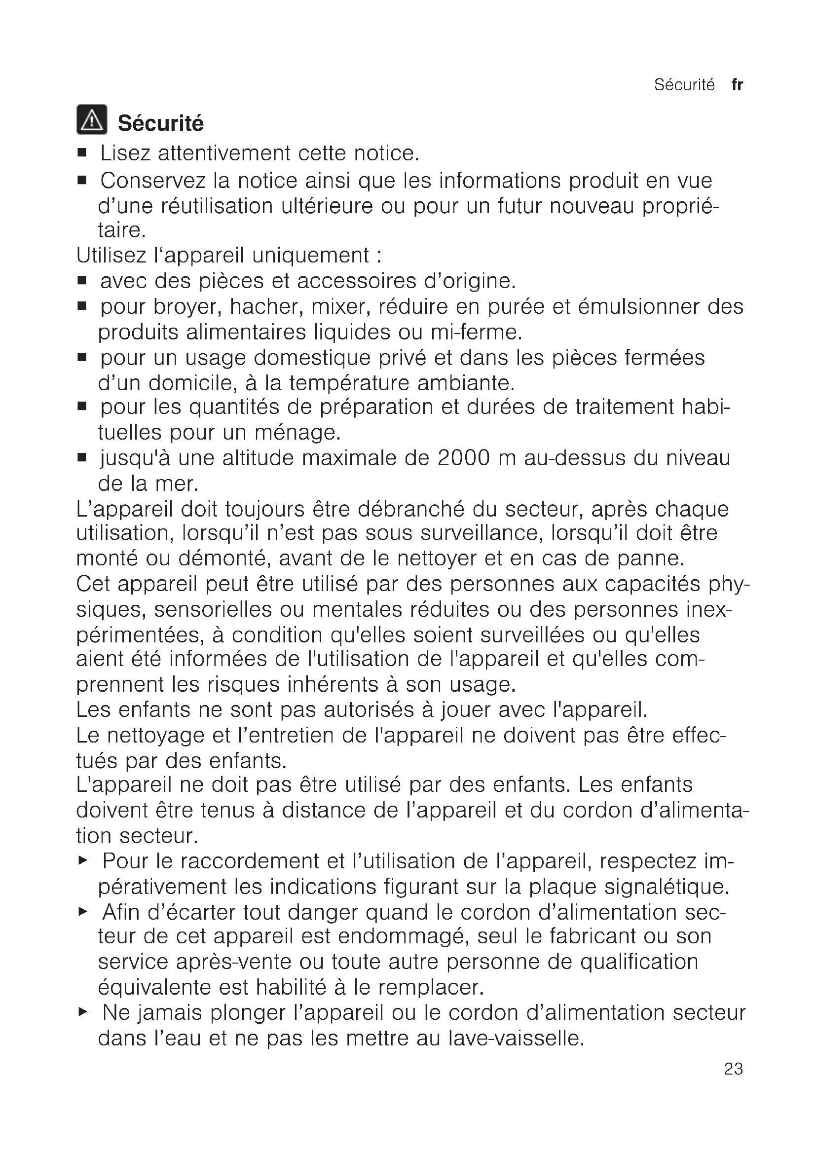 Sécurité ¡ Lisez attentivement cette notice. ¡ Conservez la notice ainsi que les informations produit en vue d’une réutilisation ultérieure ou pour un futur nouveau proprié- taire. Utilisez l‘appareil uniquement: ¡ avec des pièces et accessoires d’origine. ¡ pour broyer, hacher, mixer, réduire en purée et émulsionner des produits alimentaires liquides ou mi-ferme. ¡ pour un usage domestique privé et dans les pièces fermées d’un domicile, à la température ambiante. ¡ pour les quantités de préparation et durées de traitement habi- tuelles pour un ménage. ¡ jusqu'à une altitude maximale de 2000m au-dessus du niveau de la mer. L’appareil doit toujours être débranché du secteur, après chaque utilisation, lorsqu’il n’est pas sous surveillance, lorsqu’il doit être monté ou démonté, avant de le nettoyer et en cas de panne. Cet appareil peut être utilisé par des personnes aux capacités phy- siques, sensorielles ou mentales réduites ou des personnes inex- périmentées, à condition qu'elles soient surveillées ou qu'elles aient été informées de l'utilisation de l'appareil et qu'elles com- prennent les risques inhérents à son usage. Les enfants ne sont pas autorisés à jouer avec l'appareil. Le nettoyage et l’entretien de l'appareil ne doivent pas être effec- tués par des enfants. L'appareil ne doit pas être utilisé par des enfants. Les enfants doivent être tenus à distance de l’appareil et du cordon d’alimenta- tion secteur. ▶ Pour le raccordement et l’utilisation de l’appareil, respectez im- pérativement les indications figurant sur la plaque signalétique. ▶ Afin d’écarter tout danger quand le cordon d’alimentation sec- teur de cet appareil est endommagé, seul le fabricant ou son service après-vente ou toute autre personne de qualification équivalente est habilité à le remplacer. ▶ Ne jamais plonger l’appareil ou le cordon d’alimentation secteur dans l’eau et ne pas les mettre au lave-vaisselle.fr Prévenir les dégâts matériels