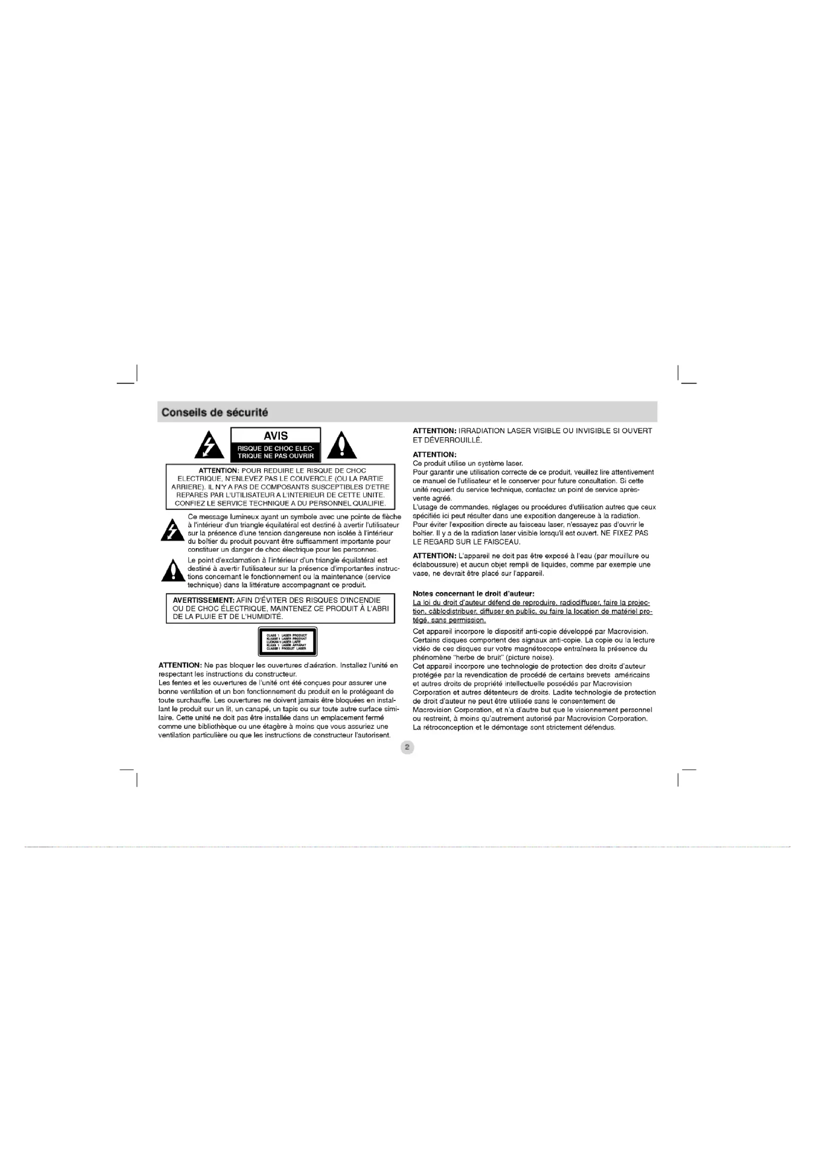securite (Suite) IntroductionATTENTION:LIREETOBSERVERTOUSLESAVERTISSE-MENTSETLESINSTRUCTIONSDECEGUIDED'UTILISATIONAINSI QUE CEUX INDIQUES SURL'APPAREIL.CONSERVERCEGUIDEPOUR REFERENCE ULTERIEURE. produit aete fabrique ettesteenfonctiondelasecuritedel'utilisateur. Toutefois, unemauvaiseutilisation peut causerun risque dechoc electrique oud'incendie.Observerles precautions mentionneesdansce guide concernant l'installation, l'utilisationetleservice.Cet appareil necontientaucune piece pouvant etre reparee parl'utilisateur.NEPASENLEVERLECOUVERCLE ARRIERE POUR EVITER UNEEXPOSITION UNETENSIONDANGEREUSE. REFERER TOUTSERVICE UNTECHNICIEN QUALIFIE SEULEMENT.1.Lirelesinstructions-Lireattentivementtouteslesinstructionsetlesconseilsdesecuriteavantdefairefonctionner l'appareil. 2.Conserver ces instructions-Lesinstructionsde securite, defonctionnementetd'utilisationdoiventetreconser-veespourreferenceulterieure.3.Observer tous lesavertissements-Touslesavertissementssur l'appareil etdanslesinstructionsdoiventetreobserves.4.Suivre toutes lesinstructions-Observertouteslesinstructions.5.Nepasutiliserce produit pres del'eau-Par exemple pres d'une piscine, d'un bain, d'un evier, dansunsous-solhumideetdansd'autresendroitssimilaires.6. Nettoyer seulementavecunchiffon propre -Debranchercet appareil dela prise muraleavantdele nettoyer. Nepasutiliserde produits nettoyants liquides. CONSIGNES