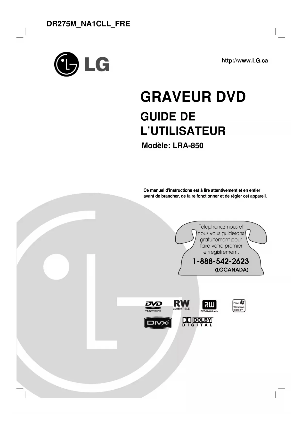 B)/(PR) 0.7 V (p-p), 75 Ω, RCA jack x 2 Audio output (digital audio) 0.5 V (p-p), 75 Ω, RCA jack x 1 Audio output (analog audio) 2.0 Vrms (1 KHz, 0 dB), 600 Ω, RCA jack (L, R) x 2 Accessory: RF Coaxial Cable . . . . . . . . . . . . . . . . . . . . . . . . .1 Remote control . . . . . . . . . . . . . . . . . .1 Batteries . . . . . . . . . . . . . . . . . . . . . . . . . . . . . . .2 Design and specifications are subject to change without notice. P/NO: MFL36929032DR275M_NA1CLL_FRE GRAVEUR DVD GUIDE DE L’UTILISATEUR Modèle: LRA-850 Ce manuel d’instructions est à lire attentivement et en entieravant de brancher, de faire fonctionner et de régler cet appareil. http://www.LG.ca Téléphonez-nous et nous vous guiderons gratuitement pour faire votre premier enregistrement. 1-888-542-2623 (LGCANADA)2 Le symbole du flash lumineux en forme de flèche dans un triangle équilatéral indique à l’intérieur de l’appareil, d’éléments à haute tension non-isolés, d’une puissance suffisante pour provoquer un choc électrique. Le point d’exclamation dans un triangle équilatéral indique à l’utilisateur la présence, dans le guide accompagnant le produit, d’instructions importantes relatives au fonctionnement et à l’entretien (SAV). ATTENTION: Ne pas installer cet équipement à un endroit confiné tel qu’une bibliothèque ou similaire.