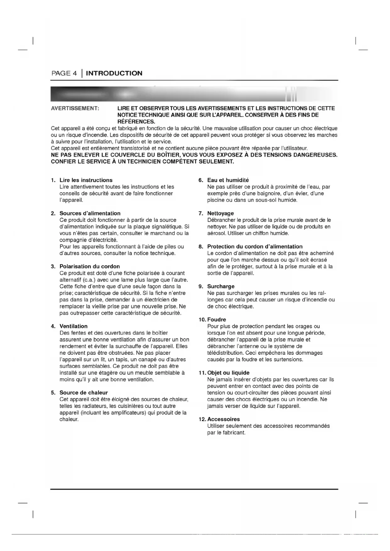 fabrique enfonctiondelasecurite.Unemauvaiseutilisationpourcauserunchoc electrique ouun risque d'incendie.Les dispositifs desecuritede cet appareil peuvent vous proteger sivousobservezlesmarchesasuivrepour l'installation, l'utilisation leservice.Cet appareil est entierementtransistorise necontientaucune piece pouvant etre reparee parl'utilisateur.NEPASENLEVERLECOUVERCLEDU BOITIER, VOUSVOUSEXPOSEZ DESTENSIONSDANGEREUSES.CONFIERLESERVICE UNTECHNICIEN COMPETENT SEULEMENT. LirelesinstructionsLireattentivement toutes lesinstructions lesconseilsdesecurite avant defairefonctionner l'appareil.