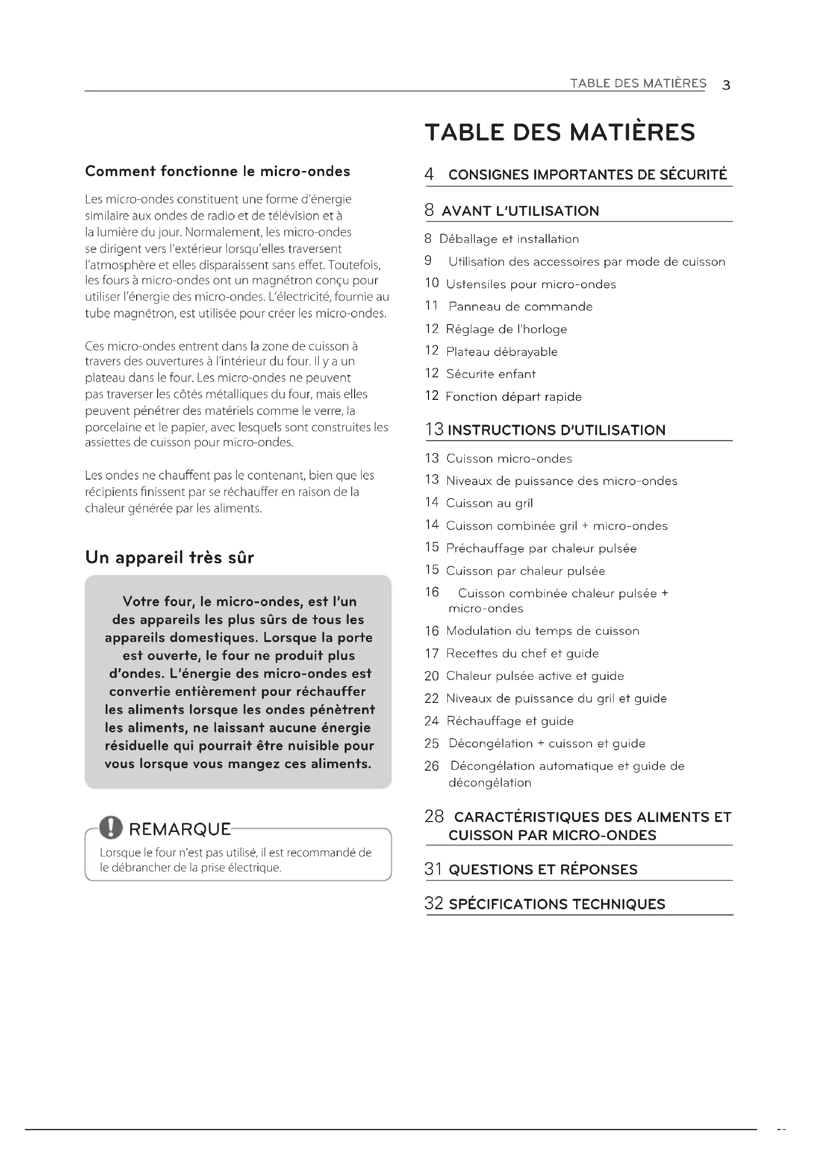 LISEZ ATTENTIVEMENT LE PRESENT MANUEL DE L’UTILISATEUR AVANT D’UTILISER L’APPAREIL. SOLAR SERIES P/No. : MFL67160162 MJ328 (Selon les modèles. Vérifiez les spécifications de votre modèle.)3 TABLE DES MATIèRES Comment fonctionne le micro-ondes Les micro-ondes constituent une forme d’énergie similaire aux ondes de radio et de télévision et à la lumière du jour. Normalement, les micro-ondes se dirigent vers l’extérieur lorsqu’elles traversent l’atmosphère et elles disparaissent sans eet. Toutefois, les fours à micro-ondes ont un magnétron conçu pour utiliser l’énergie des micro-ondes. L’électricité, fournie au tube magnétron, est utilisée pour créer les micro-ondes.Ces micro-ondes entrent dans la zone de cuisson à travers des ouvertures à l’intérieur du four. Il y a un plateau dans le four. Les micro-ondes ne peuvent pas traverser les côtés métalliques du four, mais elles peuvent pénétrer des matériels comme le verre, la porcelaine et le papier, avec lesquels sont construites les assiettes de cuisson pour micro-ondes. Les ondes ne chauent pas le contenant, bien que les récipients nissent par se réchauer en raison de la chaleur générée par les aliments. Votre four, le micro-ondes, est l’un des appareils les plus sûrs de tous les appareils domestiques. Lorsque la porte est ouverte, le four ne produit plus d’ondes. L’énergie des micro-ondes est convertie entièrement pour réchauffer les aliments lorsque les ondes pénètrent les aliments, ne laissant aucune énergie résiduelle qui pourrait être nuisible pour vous lorsque vous mangez ces aliments. Un appareil très sûr