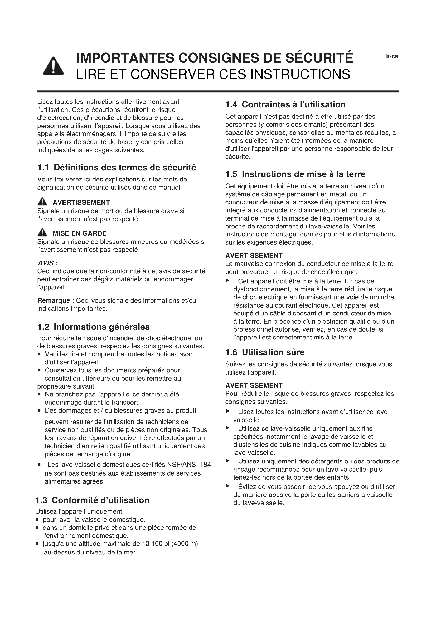 app.fr-caLisez toutes les instructions attentivement avant l’utilisation. Ces précautions réduiront le risque d’électrocution, d’incendie et de blessure pour les personnes utilisant l’appareil. Lorsque vous utilisez des appareils électroménagers, il importe de suivre les précautions de sécurité de base, y compris celles indiquées dans les pages suivantes. 1.1 Définitions des termes de sécurité Vous trouverez ici des explications sur les mots de signalisation de sécurité utilisés dans ce manuel.AVERTISSEMENTSignale un risque de mort ou de blessure grave si l’avertissement n’est pas respecté.MISE EN GARDESignale un risque de blessures mineures ou modérées si l’avertissement n’est pas respecté. AVIS : Ceci indique que la non-conformité à cet avis de sécurité peut entraîner des dégâts matériels ou endommager l'appareil.Remarque:Ceci vous signale des informations et/ou indications importantes. 1.2 Informations générales Pour réduire le risque d'incendie, de choc électrique, ou de blessures graves, respectez les consignes suivantes. ¡ Veuillez lire et comprendre toutes les notices avantd’utiliser l’appareil.¡ Conservez tous les documents préparés pourconsultation ultérieure ou pour les remettre au propriétaire suivant.¡ Ne branchez pas l’appareil si ce dernier a étéendommagé durant le transport.¡ Des dommages et / ou blessures graves au produitpeuvent résulter de l'utilisation de techniciens de service non qualifiés ou de pièces non originales. Tous les travaux de réparation doivent être effectués par un technicien d’entretien qualifié utilisant uniquement des pièces de rechange d’origine. ¡ Les lave-vaisselle domestiques certifiés NSF/ANSI184 ne sont pas destinés aux établissements de services alimentaires agréés. 1.3 Conformité d’utilisation Utilisez l'appareil uniquement:¡ pour laver la vaisselle domestique.¡ dans un domicile privé et dans une pièce fermée del'environnement domestique.¡ jusqu'à une altitude maximale de 13100 pi (4000m) au-dessus du niveau de la mer. 1.4 Contraintes à l’utilisation Cet appareil n'est pas destiné à être utilisé par des personnes (y compris des enfants) présentant des capacités physiques, sensorielles ou mentales réduites, à moins qu'elles n'aient été informées de la manière d'utiliser l'appareil par une personne responsable de leur sécurité. 1.5 Instructions de mise à la terre Cet équipement doit être mis à la terre au niveau d’un système de câblage permanent en métal, ou un conducteur de mise à la masse d’équipement doit être intégré aux conducteurs d’alimentation et connecté au terminal de mise à la masse de l’équipement ou à la broche de raccordement du lave-vaisselle. Voir les instructions de montage fournies pour plus d’informations sur les exigences électriques.AVERTISSEMENTLa mauvaise connexion du conducteur de mise à la terre peut provoquer un risque de choc électrique. ▶ Cet appareil doit être mis à la terre. En cas de dysfonctionnement, la mise à la terre réduira le risquede choc électrique en fournissant une voie de moindrerésistance au courant électrique. Cet appareil estéquipé d’un câble disposant d’un conducteur de miseà la terre. En présence d’un électricien qualifié ou d’unprofessionnel autorisé, vérifiez, en cas de doute, sil’appareil est correctement mis à la terre.