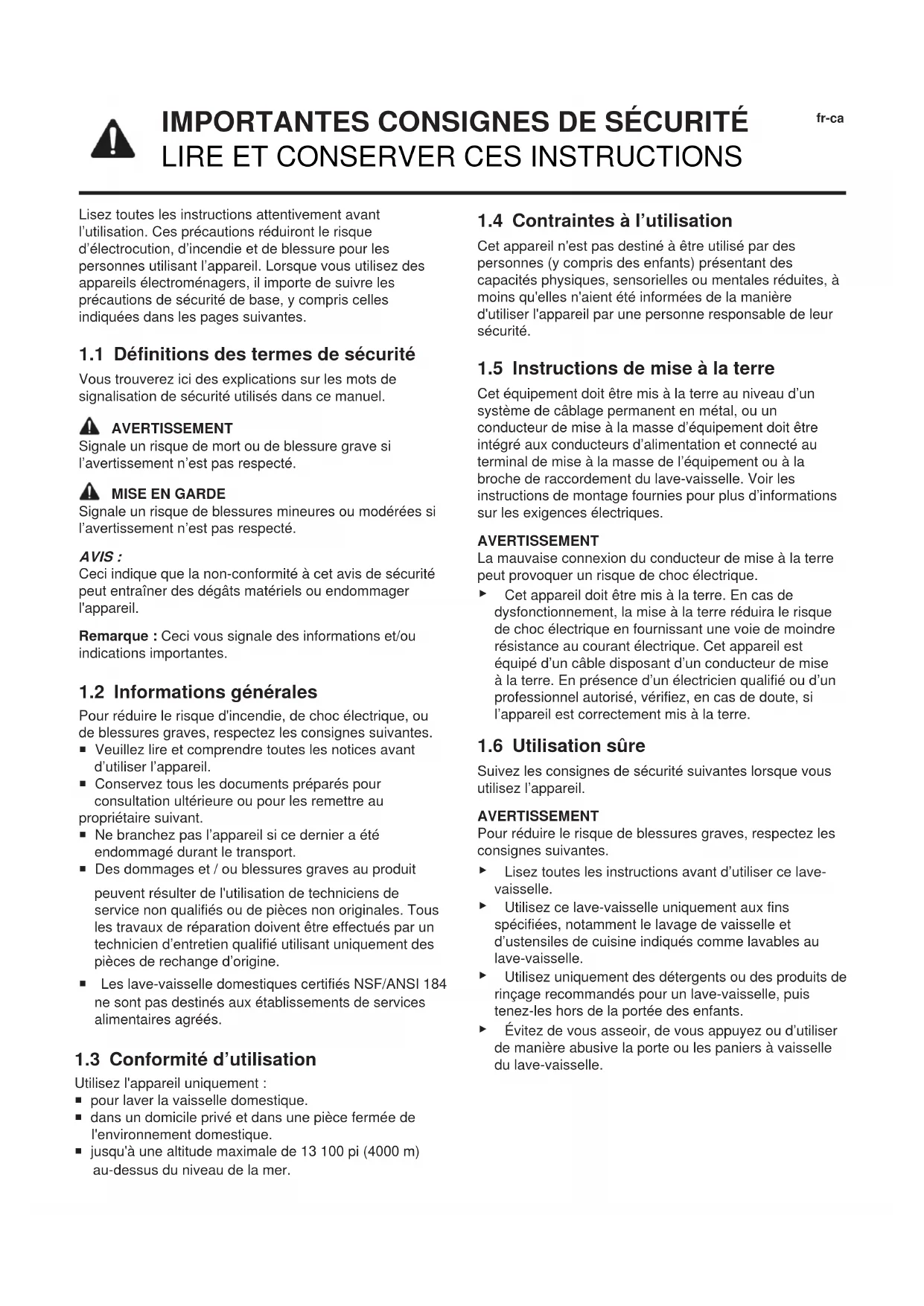 app.fr-caLisez toutes les instructions attentivement avant l’utilisation. Ces précautions réduiront le risque d’électrocution, d’incendie et de blessure pour les personnes utilisant l’appareil. Lorsque vous utilisez des appareils électroménagers, il importe de suivre les précautions de sécurité de base, y compris celles indiquées dans les pages suivantes. 1.1 Définitions des termes de sécurité Vous trouverez ici des explications sur les mots de signalisation de sécurité utilisés dans ce manuel.AVERTISSEMENTSignale un risque de mort ou de blessure grave si l’avertissement n’est pas respecté.MISE EN GARDESignale un risque de blessures mineures ou modérées si l’avertissement n’est pas respecté. AVIS : Ceci indique que la non-conformité à cet avis de sécurité peut entraîner des dégâts matériels ou endommager l'appareil.Remarque:Ceci vous signale des informations et/ou indications importantes. 1.2 Informations générales Pour réduire le risque d'incendie, de choc électrique, ou de blessures graves, respectez les consignes suivantes. ¡ Veuillez lire et comprendre toutes les notices avantd’utiliser l’appareil.¡ Conservez tous les documents préparés pourconsultation ultérieure ou pour les remettre au propriétaire suivant.¡ Ne branchez pas l’appareil si ce dernier a étéendommagé durant le transport.¡ Des dommages et / ou blessures graves au produitpeuvent résulter de l'utilisation de techniciens de service non qualifiés ou de pièces non originales. Tous les travaux de réparation doivent être effectués par un technicien d’entretien qualifié utilisant uniquement des pièces de rechange d’origine. ¡ Les lave-vaisselle domestiques certifiés NSF/ANSI184 ne sont pas destinés aux établissements de services alimentaires agréés. 1.3 Conformité d’utilisation Utilisez l'appareil uniquement:¡ pour laver la vaisselle domestique.¡ dans un domicile privé et dans une pièce fermée del'environnement domestique.¡ jusqu'à une altitude maximale de 13100 pi (4000m) au-dessus du niveau de la mer. 1.4 Contraintes à l’utilisation Cet appareil n'est pas destiné à être utilisé par des personnes (y compris des enfants) présentant des capacités physiques, sensorielles ou mentales réduites, à moins qu'elles n'aient été informées de la manière d'utiliser l'appareil par une personne responsable de leur sécurité. 1.5 Instructions de mise à la terre Cet équipement doit être mis à la terre au niveau d’un système de câblage permanent en métal, ou un conducteur de mise à la masse d’équipement doit être intégré aux conducteurs d’alimentation et connecté au terminal de mise à la masse de l’équipement ou à la broche de raccordement du lave-vaisselle. Voir les instructions de montage fournies pour plus d’informations sur les exigences électriques.AVERTISSEMENTLa mauvaise connexion du conducteur de mise à la terre peut provoquer un risque de choc électrique. ▶ Cet appareil doit être mis à la terre. En cas de dysfonctionnement, la mise à la terre réduira le risquede choc électrique en fournissant une voie de moindrerésistance au courant électrique. Cet appareil estéquipé d’un câble disposant d’un conducteur de miseà la terre. En présence d’un électricien qualifié ou d’unprofessionnel autorisé, vérifiez, en cas de doute, sil’appareil est correctement mis à la terre.