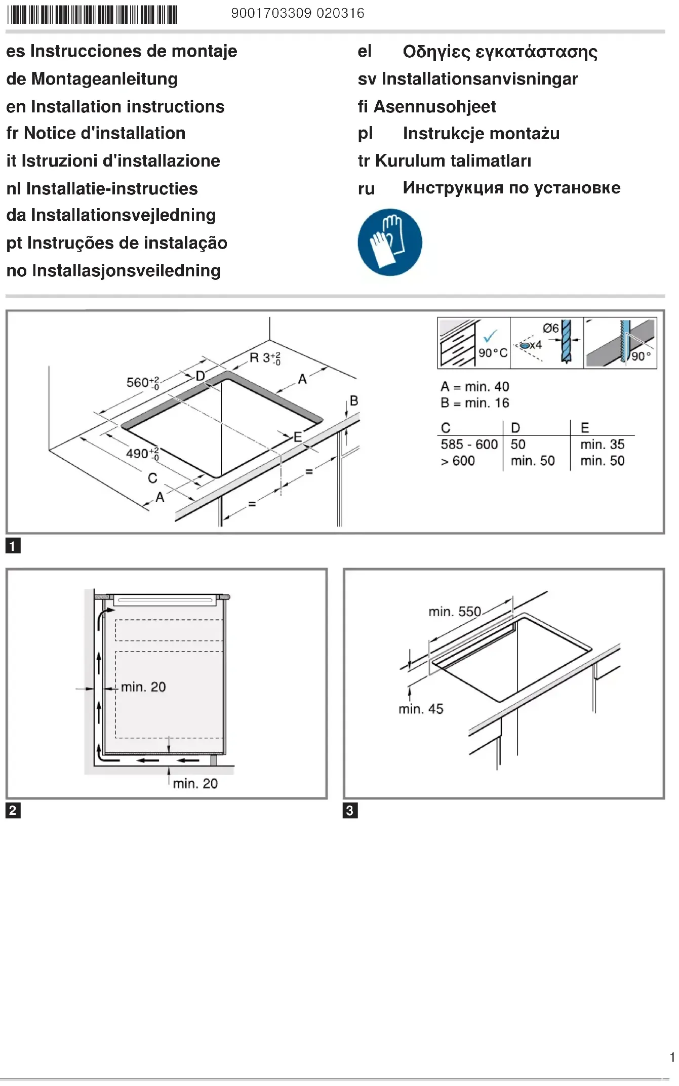 les joints du carrelage avec un joint en silicone. Remarque:Ne pas plier ou coincer le câble de rac- cordement et l'éloigner d'arêtes coupantes et d'élé- ments chauds.12 Insérer la table de cuisson dans la découpe du plan de travail avec une profondeur de 500mm