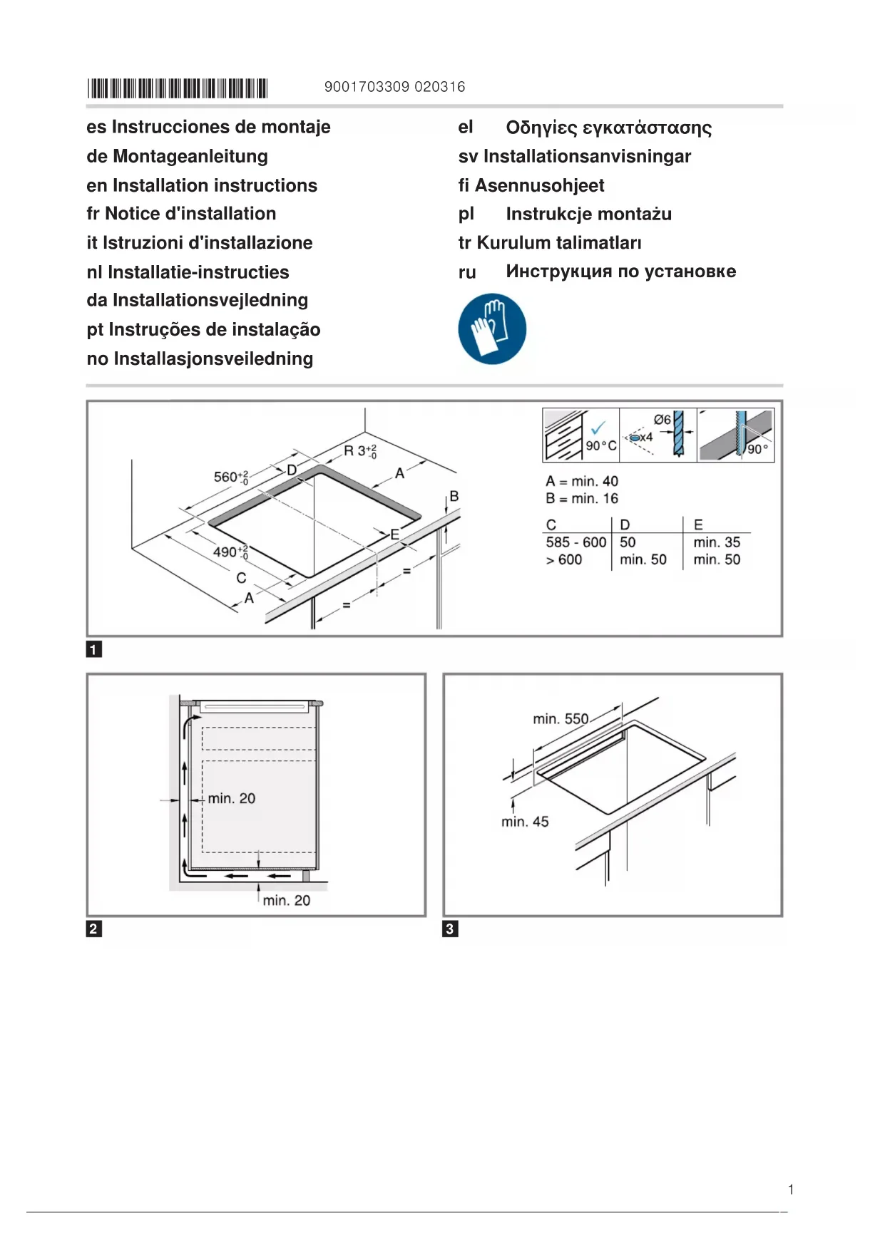 les joints du carrelage avec un joint en silicone. Remarque:Ne pas plier ou coincer le câble de rac- cordement et l'éloigner d'arêtes coupantes et d'élé- ments chauds.12 Insérer la table de cuisson dans la découpe du plan de travail avec une profondeur de 500mm