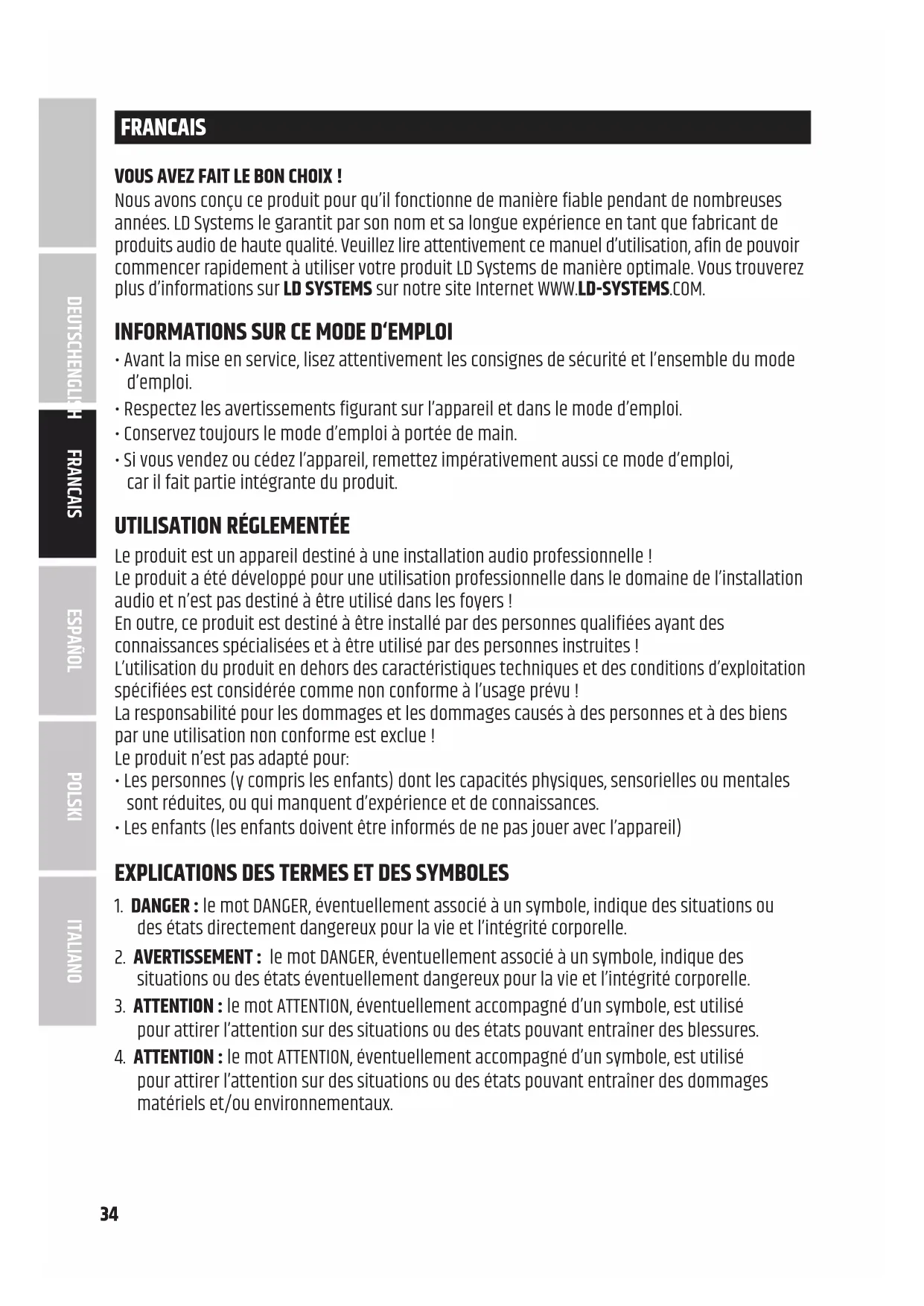 de 2000 m d'altitude. ATTENTION : Le raccordement de câbles de signal peut entraîner des bruits parasites importants. Veillez à ce que les appareils raccordés à la sortie soient mis en sourdine lors des opérations de branchement. Dans le cas contraire, les niveaux de bruits parasites peuvent entraîner des dommages. ATTENTION AUX VOLUMES ÉLEVÉS DES PRODUITS AUDIO ! Cet appareil est destiné à un usage professionnel. L'utilisation commerciale de cet appareil est soumise aux réglementations et directives nationales en vigueur en matière de prévention des accidents. Lésions auditives dues à un volume sonore élevé et à une exposition continue : l'utilisation de ce produit peut générer des niveaux de pression sonore (SPL) élevés susceptibles d'entraîner des lésions auditives. Évitez l'exposition à des volumes sonores élevés. DEUTSCHFRANCAIS ESPAÑOL ENGLISH ITALIANO POLSKI38 NOTES POUR L’ÉQUIPEMENT D’INSTALLATION À L’INTÉRIEUR