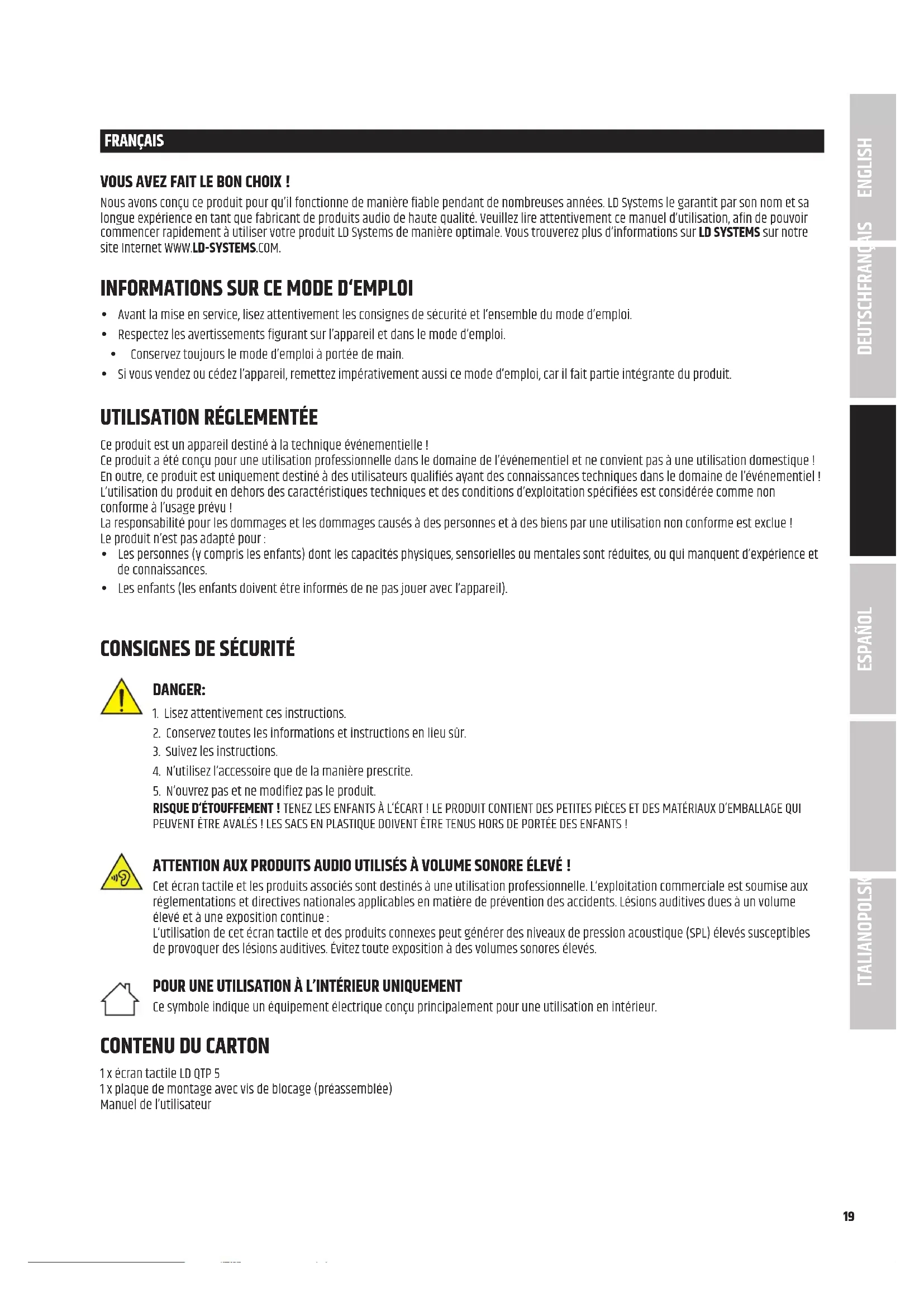 1 x écran tactile LD QTP 5 1 x plaque de montage avec vis de blocage (préassemblée) Manuel de l’utilisateur DEUTSCHFRANÇAIS ESPAÑOL ENGLISH ITALIANO POLSKI20