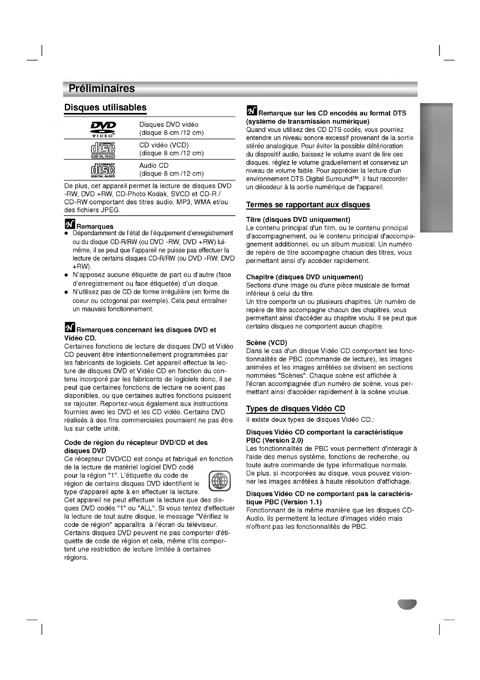 - -30 Caracteristiquestechniques INTRODUCTION Preliminaires Disques utilisables DisquesDVDvideo(disque8cm/12cm)CDvideo(VCD)(disque8cm/12cm)AudioCD(disque8cm/12cm)Deplus, cet appareil permet lalecturededisquesDVD -RW, DVD +RW, CD-Photo Kodak, SVCD CD-R/CD-RW comportant destitres audio, MP3, WMAet/oudesfichiersJPEG.Remarques Dependamment del'etatde l'equipement d'enregistrementoududisqueCD-R/RW(ouDVD -RW, DVD+RW)lui-meme,ilse peut quel'appareilnepuissepaseffectuerlalecturedecertainsdisquesCD-R/RW(ouDVD -RW, DVD+RW).N'apposezaucune etiquette part oud'autre(faced'enregistrementouface etiquetee) d'undisque.N'utilisezpasdeCDdeforme irreguliere (enformedecoeurouoctogonalparexemple).Cela peut entrainerunmauvaisfonctionnement.RemarquesconcernantlesdisquesDVDet Video CD.CertainesfonctionsdelecturededisquesDVD VideoCD peuvent etreintentionnellement programmees parlesfabricantsdelogiciels.Cetappareileffectuelalec- ture dedisquesDVD VideoCDenfonctionducon- tenu incorpore parlesfabricantsdelogiciels donc, ilse peut quecertainesfonctionsdelecturenesoientpasdisponibles,ouquecertaines autres fonctionspuissentserajouter.Reportez-vous egalement auxinstructionsfourniesaveclesDVD lesCDvideo.CertainsDVDrealisesadesfinscommercialespourraientnepasetrelussur cette unite.Codede region recepteur DVD/CDetdesdisquesDVDCe recepteur DVD/CD est concu p. 315