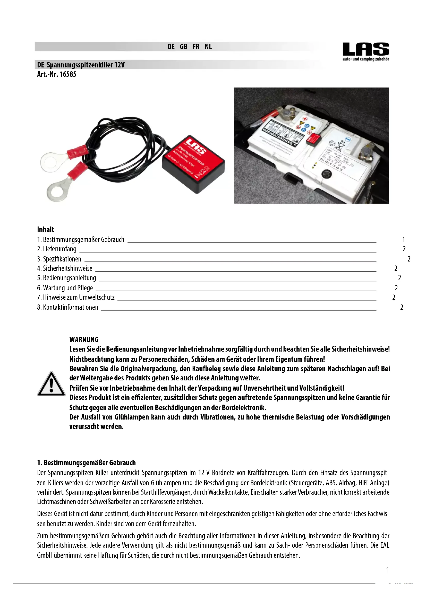 CAUTION: Before starting to install the voltage-peak killer, read your vehicle manual about disconnecting the battery. Disconnecting the battery can cause the loss of information in the on-board computer and the radio settings. First switch o all electric consumers. Remove the cable clamp from the minus pole of the battery. Fasten the eyelets to the connection cable of Do not dispose of the device in domestic waste! Electrical and electronic scrap has to be collected separately and disposed of in an environmentally responsible manner for recycling. Please contact your community or city administration regarding disposal options for electrical and electronic scrap.5 FR Fusible pour piques de tension 12V N° d‘art. 16585 AVERTISSEMENT Lisez attentivement le mode d‘emploi avant la mise en service et respectez toutes les consignes de sécurité ! Tout non-respect de ces consignes peut entraîner des dommages corporels, endommager l‘appareil ou vos biens ! Conservez l‘emballage d‘origine en lieu sûr, de même que le bon d‘achat et ce mode d‘emploi an de pouvoir le compulser à tout moment ! Si vous transmettez cet appareil à quelqu‘un d‘autre, fournissez également ce mode d‘emploi. Vériez l‘intégrité et l‘intégralité du contenu de l‘emballage ! Ce produit est une protection complémentaire ecace contre d‘éventuelles piques de tension mais n‘est pas une protection contre tous éventuels dommages au circuit électrique. La défaillance d‘une ampoule peut aussi être causée par une charge thermique trop importante ou par des dommages préalables.