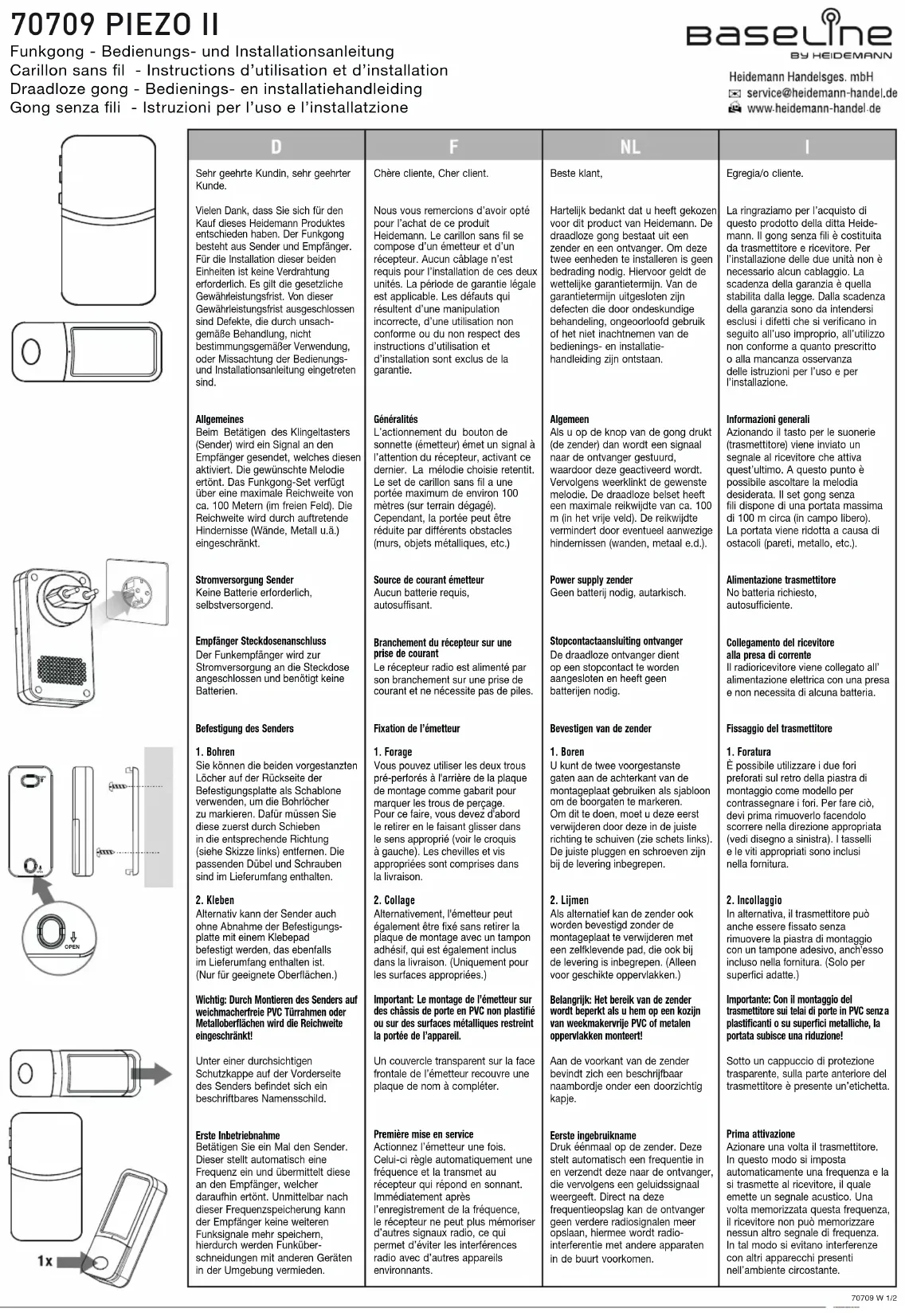 plastificanti o su superfici metalliche, la portata subisce una riduzione! Sotto un cappuccio di protezione trasparente, sulla parte anteriore del trasmettitore è presente un’etichetta. Prima attivazione Azionare una volta il trasmettitore. In questo modo si imposta automaticamente una frequenza e la si trasmette al ricevitore, il quale emette un segnale acustico. Una volta memorizzata questa frequenza, il ricevitore non può memorizzare nessun altro segnale di frequenza. In tal modo si evitano interferenze con altri apparecchi presenti nell’ambiente circostante. Chère cliente, Cher client. Nous vous remercions d’avoir opté pour l’achat de ce produit Heidemann. Le carillon sans l se compose d’un émetteur et d’un récepteur. Aucun câblage n’est requis pour l’installation de ces deux unités. La période de garantie légale est applicable. Les défauts qui résultent d’une manipulation incorrecte, d’une utilisation non conforme ou du non respect des instructions d’utilisation et d’installation sont exclus de la garantie. Généralités L’actionnement du bouton de sonnette (émetteur) émet un signal à l’attention du récepteur, activant ce dernier. La mélodie choisie retentit. Le set de carillon sans l a une portée maximum de environ 100 mètres (sur terrain dégagé). Cependant, la portée peut être réduite par différents obstacles (murs, objets métalliques, etc.) Source de courant émetteur Aucun batterie requis, autosuffisant. Branchement du récepteur sur une prise de courant Le récepteur radio est alimenté par son branchement sur une prise de courant et ne nécessite pas de piles. Fixation de l’émetteur