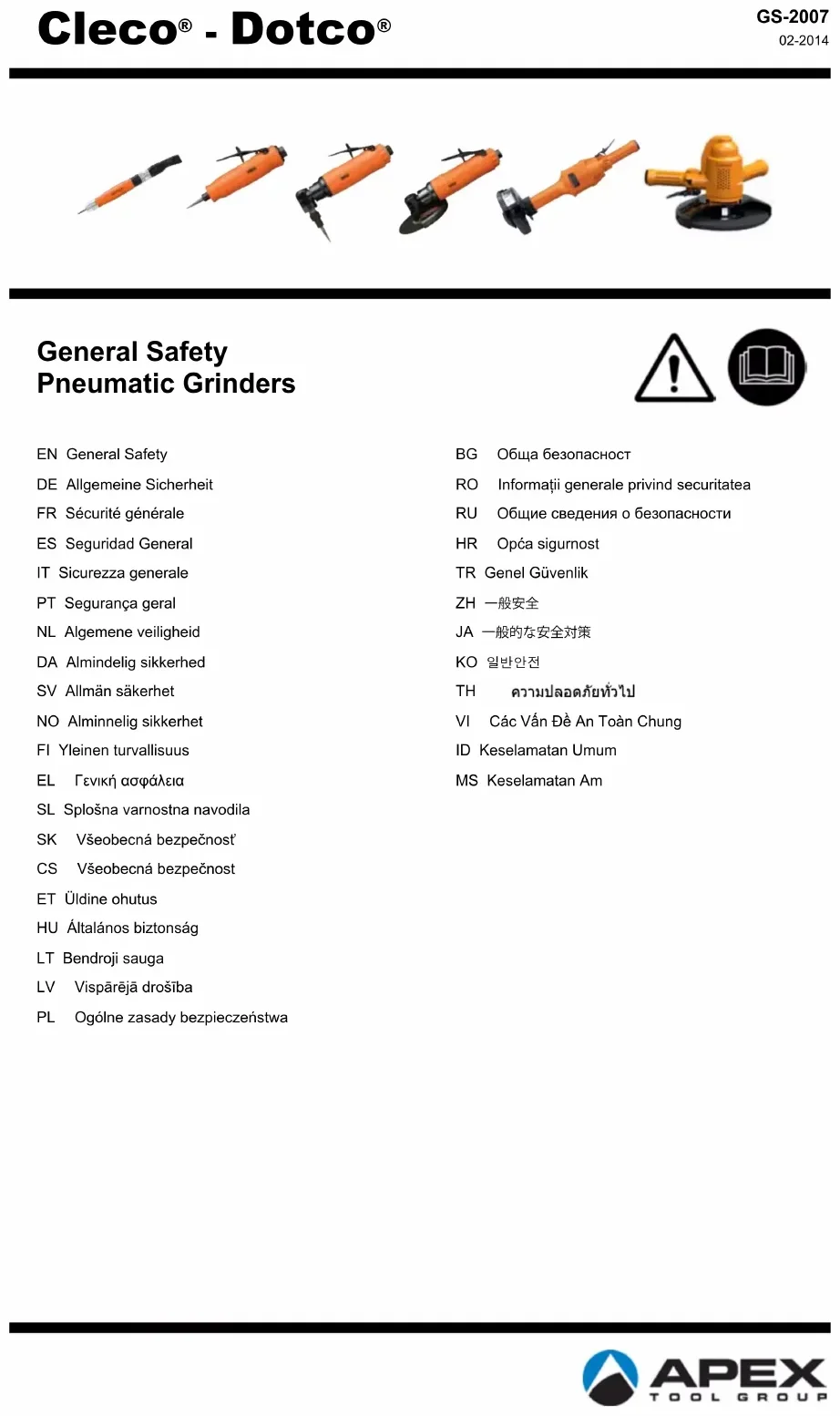 DESCRIPTION DU PRODUIT : Les meuleuses pneumatiques sont des outils manuels portatifsfonctionnantàl’aircomprimé.Lemoteurentraîneunebrocherotativesurlaquelleestxéeunemeuleouunautreoutilabrasif.Lorsquepossible,lameuleuseestéquipéed’uncarter.Lenonrespectdesconsignesdesécuritépeutentraînerdesdommagesàl’équipementoudesblessuresauxopérateurs. UTILISATION PRÉVUE : Une meuleuse pneumatique est exclusivement destinée auretrait de matériaux à l’aide de meules abrasives, de limesrotatives ou d’autres outils de meulage adaptés. Aucunemodication ne doit être apportée à la meuleuse, saufapprobationécrited’ApexToolGroup,LLCouApexToolGroupS.N.C.Touslesdispositifsdesécuritédoiventêtrecorrectementinstallés et maintenus en bon état de fonctionnement.Toute utilisation impropre ou abusive de l’outil de meulagepeutêtreextrêmementdangereuse. INSTRUCTIONS GÉNÉRALES DE SÉCURITÉ : Ces instructions de sécurité doivent en permanence êtreaccessibles aux opérateurs. Elles doivent être mises à ladisposition de l’ensemble du personnel impliqué dans lefonctionnementdel’équipement.Les opérateurs doivent avoir lu et compris les instructions de sécurité contenues dans ce document avanttoutemanipulationdel’équipement. Ces instructions de sécurité ne sont pas exhaustives. L’opérateur doit également lire et comprendre le Manuelproduit spécique à l’outil. Étudiez et respectez toutes lesréglementations fédérales, nationales et locales applicables.Ne retirez aucune des étiquettes apposées sur cet équipement. Remplacez toute étiquette endommagée et difcilement lisible. INSTALLATION DU PRODUIT : Seuldupersonneldûmentqualiéetformédoitêtreautoriséàinstaller, régler et utiliser cet équipement.ENVIRONNEMENT DE TRAVAIL :Lazonede travaildoitêtre propre, rangée,bienéclairée etparfaitement ventilée.Assurez-vous qu’aucun élément inammable oucombustiblen’estprésentdansl’environnementdetravail ; les étincelles produites par le processus de meulagerisqueraientdelesenammer.CONTRÔLE DE LA VITESSE :Contrôlez la vitesse de l’outil avant de monter une meule,aprèstouteréparation,lorsquel’outilestremisàunopérateurpourêtreutiliséoutoutesles24heures.Lenombredetourspar minute de la meuleuse doit être contrôlé à l’aide d’untachymètrecalibréandes’assurerquesavitesseeffectivene dépasse pas sa vitesse nominale.Vériezbiensiunevitessemaximaleestindiquéesurl’outildemeulage. Dans ce cas, cette vitesse doit être supérieureàlavitessenominaledel’outil.Lenonrespectdecesinstructionspeutentraînerdegravesblessuresoulamort.INSPECTION DE LA MEULE :Toutes les meules doivent être soigneusement inspectéesavant leur installation et leur utilisation. Consultez les procédures de sécurité recommandées par le fabricant de la meule. Si nécessaire, utilisez des buvards.MONTAGE ADÉQUAT DE LA MEULE ABRASIVE :Ilexistediverstypesdemeules:droites,coniques,letées,boisseau,àmoyeudéportéetsurtige.Consultezetobservezles instructions de sécurité recommandées par le fabricant de la meule. Assurez-vous que la broche, les brides et les carters recommandésparlefabricantsontéquipéssurl’outil.Équipezsystématiquementl’outildemeulaged’uncarterdeprotectionconformeàlanormeANSI/CAGIB186.1.Silecarterest endommagé, jetez-le et remplacez-le.Généralement, les limes rotatives et certains autres outils de meulagenenécessitentpasdecarters.Vériezcelaauprèsdu fabricant de l’outil de meulage et conformez-vous à sesrecommandations.Une fois l’outil de meulage et le carter montés, démarrezla meuleuse sous un établi en acier ou un dispositif de protection similaire. Portez systématiquement des lunettes de protection.Faitesfonctionnerlameuleuseàvitessemaximalependant au moins une minute pour vous assurer de son bon fonctionnement.MEULAGE SANS CARTER : Les opérateurs ne peuvent utiliser la meuleuse sanscarterdeprotectionques’ilsrespectentcesconsignes.L’utilisationinadéquated’unemeuleusesans carter de protection, y compris le non respect de ces consignes, peut entraîner de gravesblessures ou la mort.Meule de type 1 : N’utilisez pas de meule de plus de 2"(50mm)dediamètreoudeplusde1/2"(13mm)d’épaisseur.Ne dépassez jamais une vitesse périphérique de 1 800 pieds linéaires par minute (548,64 m/min.). Meule renforcée de type 1 : N’utilisez pas de meule de plusde3"(76mm)dediamètreoudeplusde1/4"(6,4mm)d’épaisseur.Nedépassezjamaisunevitessepériphériquede9500piedslinéairesparminute(2895,6m/min.).Meules à rectier : Utilisez-les pour le travail interne, àl’intérieurdelapièceàrectier.Meules sur tige :N’utilisezpasdemeulesurtigedeplusde2"(50mm)dediamètre.Autres outils de meulage :N’utilisezpasdepetitesmeulesconiques,demeulesletées,demeulesrondestaraudéesoudemeulessimilairesdeplusde3"(75mm)dediamètreetdeplusde5"(125mm)delongsanscarteràmoinsquelapiècen’offreuneprotection.MEULES À DÉCOUPER (types 1 et 27) :Fixez bien la pièce an de garantir une coupe nette et deréduire le risque de grippage.En cas d’enrayage de la meule à découper, arrêtez la meuleuse et libérez la meule. Assurez-vous que la meule est correctement xée et n’est pas endommagée avant dereprendrel’opération.N’utilisez jamais de meule à découper pour effectuer unerecticationlatérale. Sécurité générale Meuleuses pneumatiques