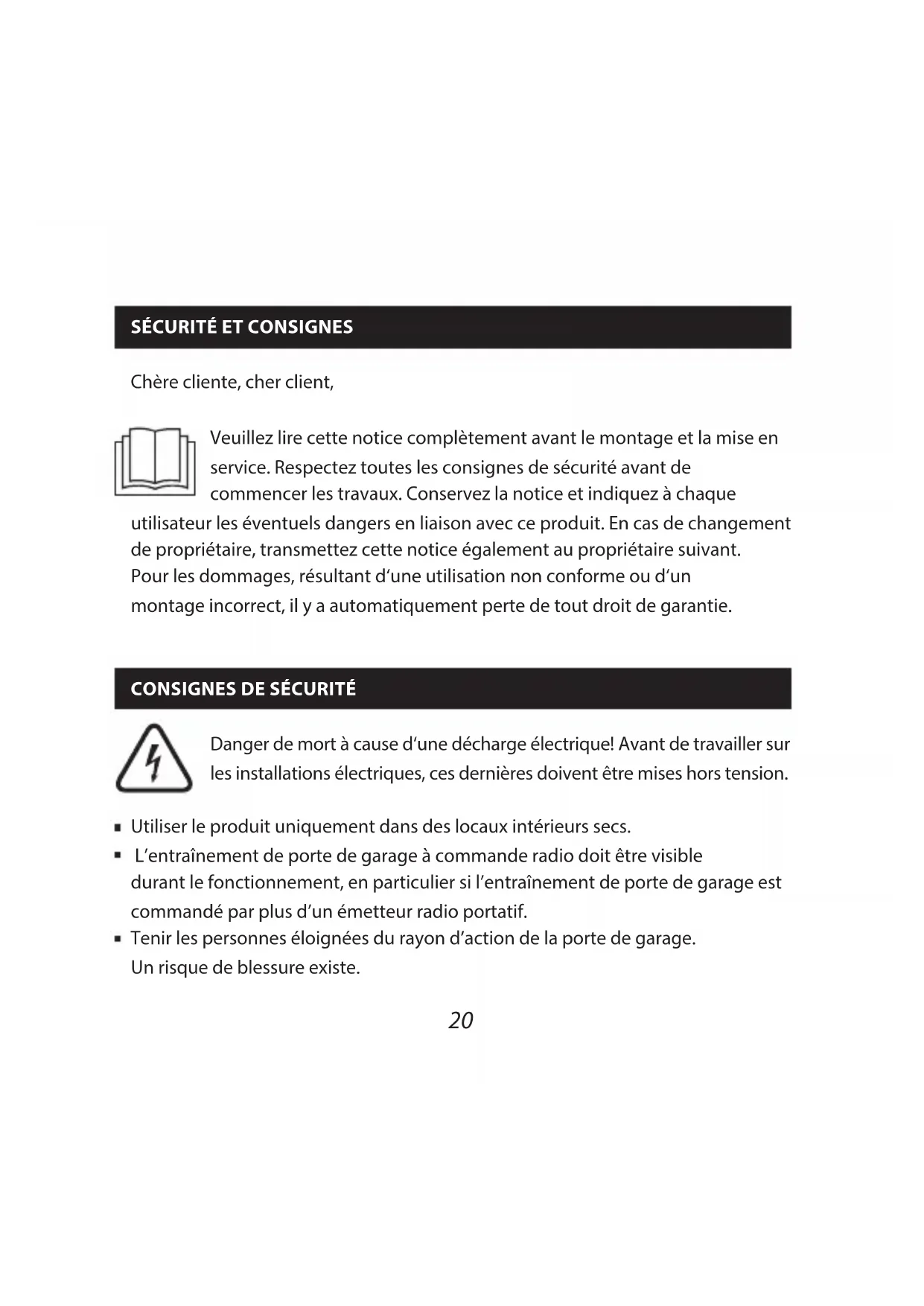 Danger de mort à cause d‘une décharge électrique! Avant de travailler sur les installations électriques, ces dernières doivent être mises hors tension Utiliser le produit uniquement dans des locaux intérieurs secs L’entraînement de porte de garage à commande radio doit être visible durant le fonctionnement, en particulier si l’entraînement de porte de garage est commandé par plus d’un émetteur radio portatif Tenir les personnes éloignées du rayon d’action de la porte de garage Un risque de blessure existe