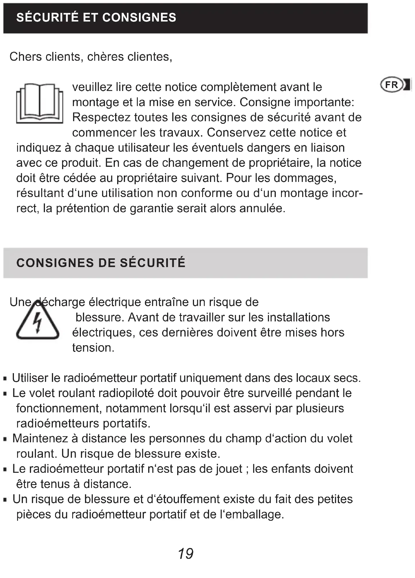 Une décharge électrique entraîne un risque de blessure Avant de travailler sur les installations électriques, ces dernières doivent être mises hors tension Utiliser le radioémetteur portatif uniquement dans des locaux secs Le volet roulant radiopiloté doit pouvoir être surveillé pendant le fonctionnement, notamment lorsqu‘il est asservi par plusieurs radioémetteurs portatifs Maintenez à distance les personnes du champ d‘action du volet roulant Un risque de blessure existe Le radioémetteur portatif n‘est pas de jouet ; les enfants doivent être tenus à distance Un risque de blessure et d‘étouement existe du fait des petites pièces du radioémetteur portatif et de l‘emballage20 Lors du fonctionnement d‘un volet roulant piloté par un radio- émetteur portatif, il faut respecter les dispositions spéciques au pays d‘utilisation Remplacez les batteries exclusivement par des batteries de même type, LR03 / AAA Ne pas faire passer le moteur tubulaire au-delà des positions nales. Risque d‘endommagement !